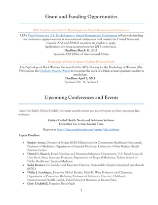 The newsletter discusses various health initiatives, including the inaugural meeting of the Consortium for Humanitarian Intervention, grant opportunities for psychologists, and upcoming webinars on global health. It highlights significant updates on the Ebola epidemic, including increased cases in Sierra Leone and Cuba's commitment to send medical aid. Additionally, it addresses the prevalence of dengue, malaria eradication efforts, and the impact of Syria's civil war on public health.