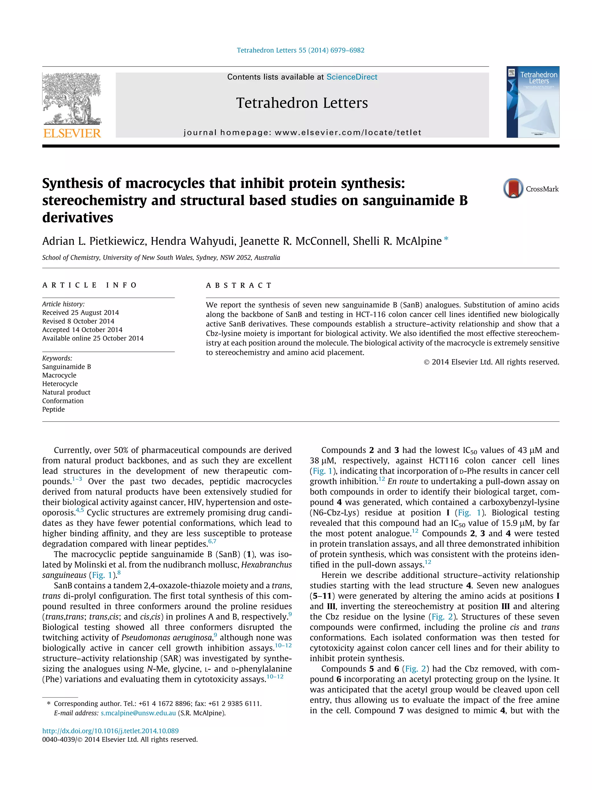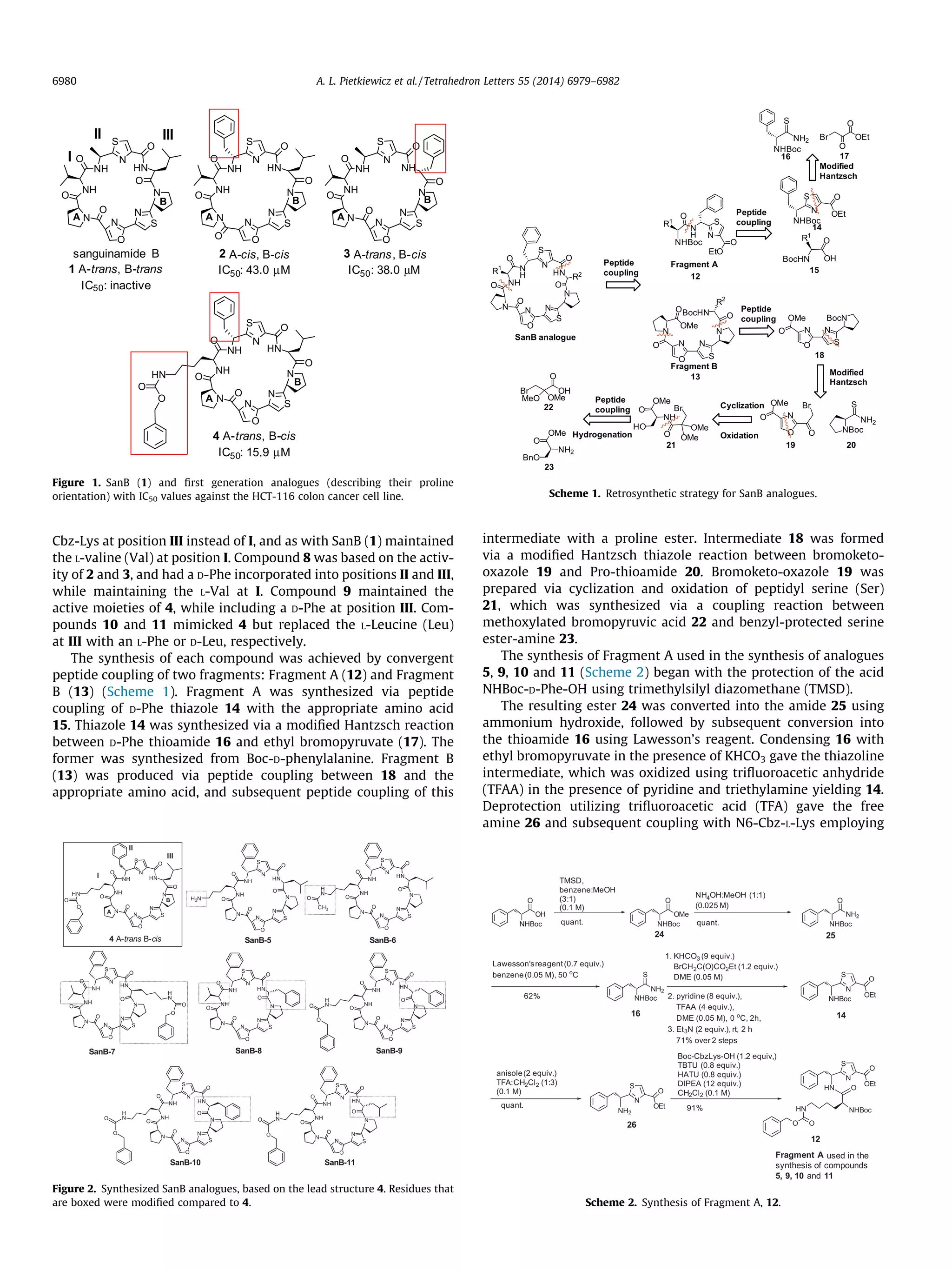 This document describes the synthesis of seven new analogues of the macrocyclic peptide sanguinamide B (SanB) and testing of their ability to inhibit protein synthesis in cancer cells. The analogues were designed by altering the amino acids at positions I and III of the SanB backbone, inverting stereochemistry at position III, and changing the protecting group on lysine. All analogues were tested for cytotoxicity against colon cancer cell lines and ability to inhibit protein synthesis. The lead compound with an IC50 of 15.9 μM against colon cancer cells contained an N6-carboxybenzyl-lysine at position I. This establishes the importance of this moiety for biological activity.