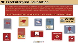 The document summarizes results from the 2014 North Carolina elections. It shows that Republicans gained control of both chambers of the state legislature. In the US Senate race, Thom Tillis defeated incumbent Kay Hagan. Most statewide races and congressional races were won by Republicans. Maps show county-by-county results and the partisan leanings of state legislative districts following the election. The summary discusses open seat races in competitive districts and races that were close.