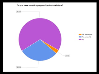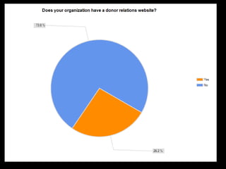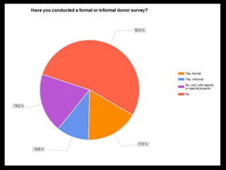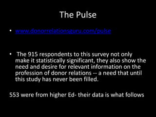 The survey of over 900 donor relations professionals provides insights into the field. It found a need and desire for information on the profession of donor relations, which this study aims to fulfill. The majority of respondents, 553, worked in higher education. The document concludes by thanking the reader and providing contact information for further information.