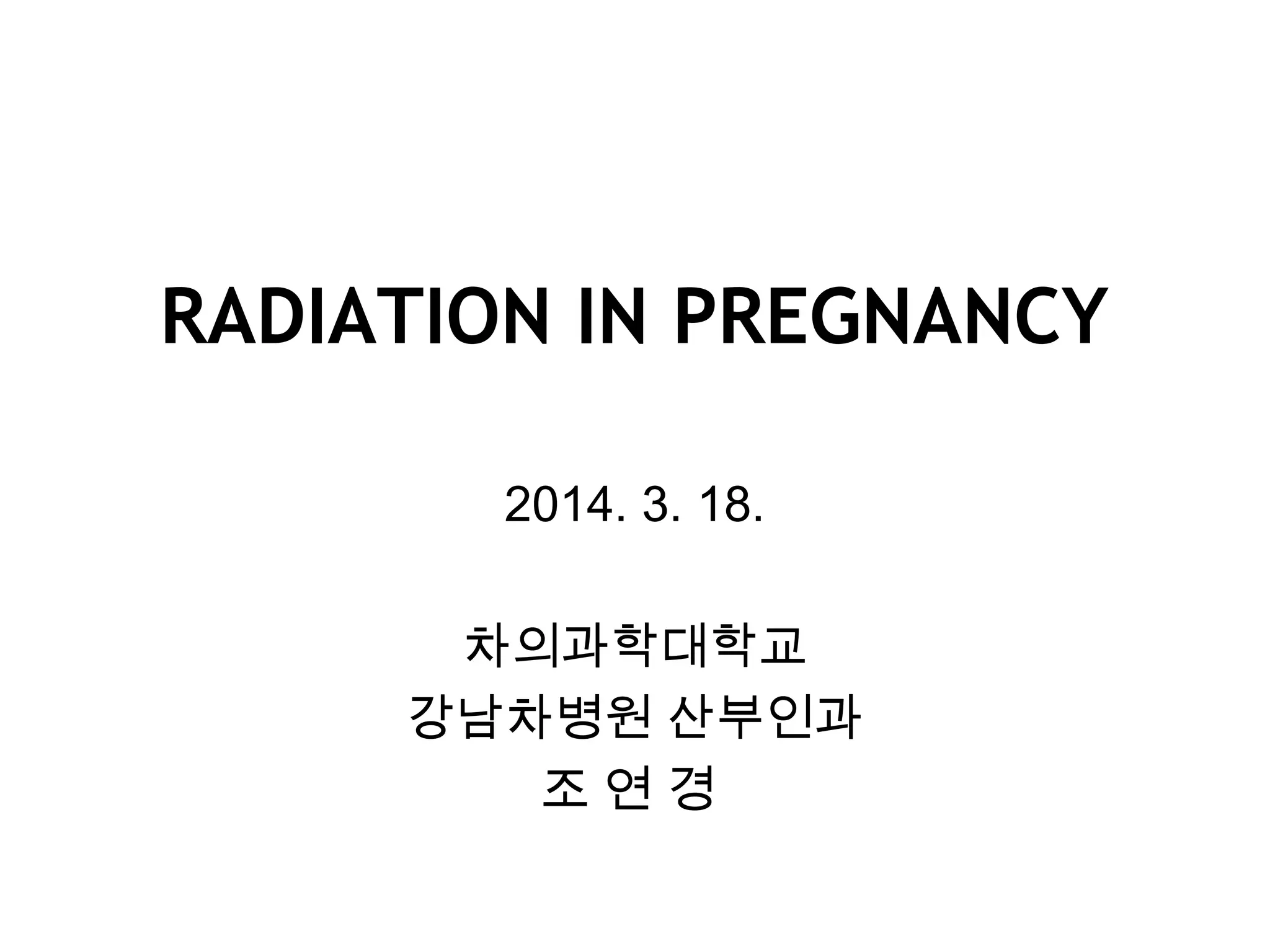 This document discusses the risks of ionizing radiation exposure during pregnancy. It defines ionizing radiation and teratogens, and outlines the critical periods of pregnancy when radiation exposure could impact fetal development. Exposure to high doses of radiation can increase risks of pregnancy loss, malformations, growth restriction, and cancer. The effects are dependent on radiation dose and gestational timing of exposure. Diagnostic procedures pose small risks but high doses over 50mGy or 100rad may cause mental retardation. Protecting the pregnant woman from unnecessary radiation is recommended.