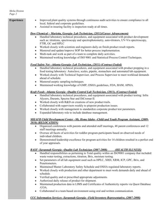 Melia Hoston seeks a position in the food service industry utilizing her background in food safety, quality management, and laboratory experience. She holds a Master's in Business Administration and Bachelor's in Biology. Her experience includes over 10 years working in quality management roles for various food companies, developing and implementing food safety systems, conducting audits, and ensuring regulatory compliance. She is proficient in Microsoft Office, laboratory equipment, and has various food safety certifications.