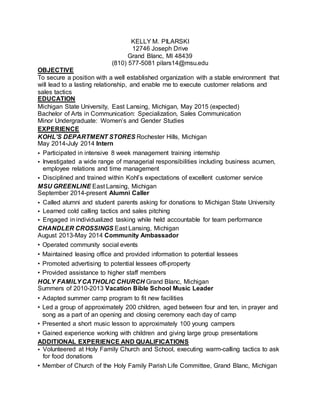Kelly Pilarski seeks a position with a stable organization where she can utilize her customer relations and sales skills. She has a Bachelor of Arts in Communication with a specialization in sales from Michigan State University. Her experience includes internships at Kohl's Department Stores and calling alumni as an MSU Greenline caller. She also has experience leading music and presentations for children at her church's vacation bible school.