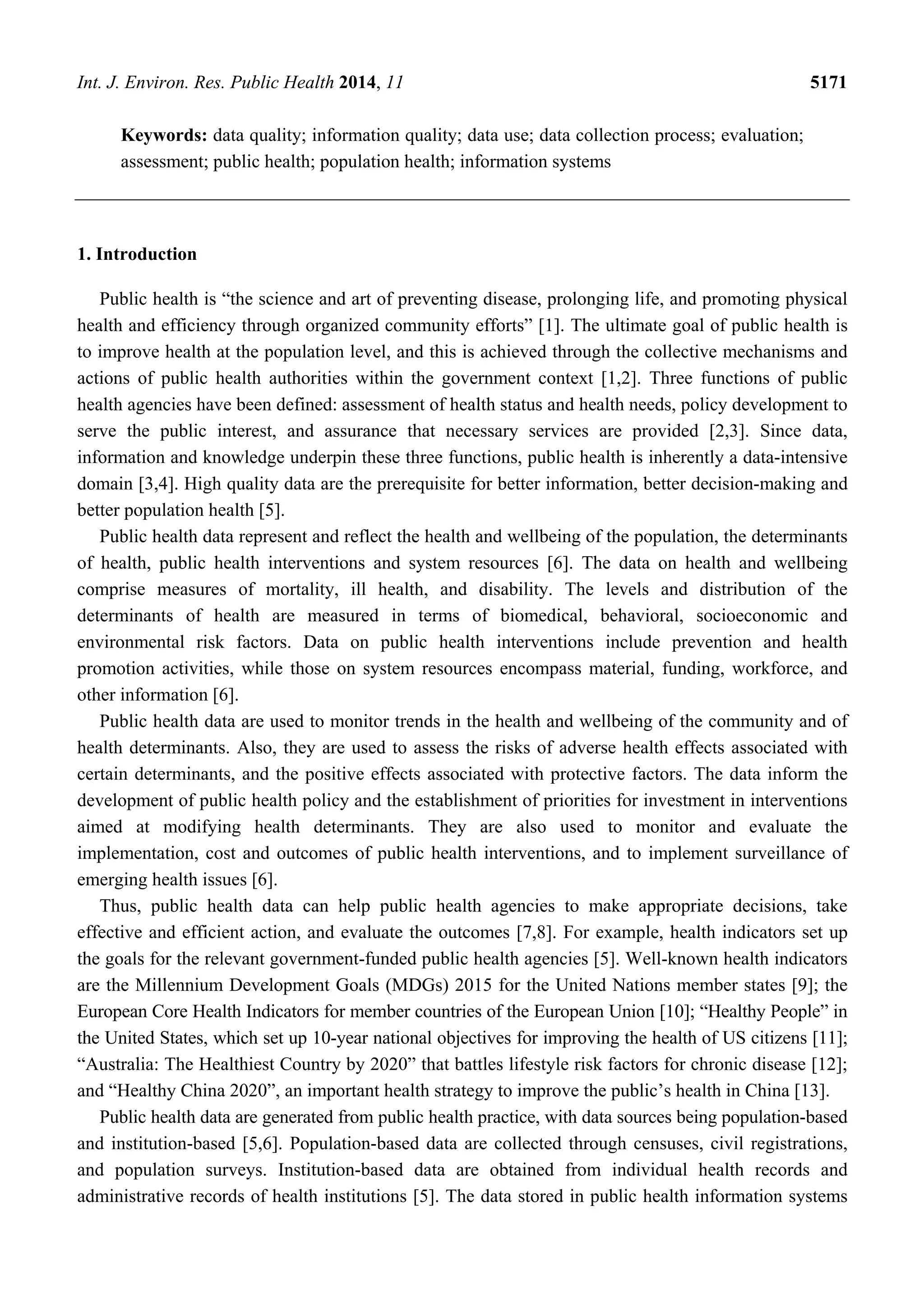 The document is a review of data quality assessment methods for public health information systems, highlighting the necessity of high-quality data for effective public health interventions. It identifies key dimensions of data quality, including data, data use, and data collection process, as well as common attributes such as completeness, accuracy, and timeliness. The review also emphasizes the limitations of current studies and the need for further research to streamline data quality definitions and improve assessment methodologies.
