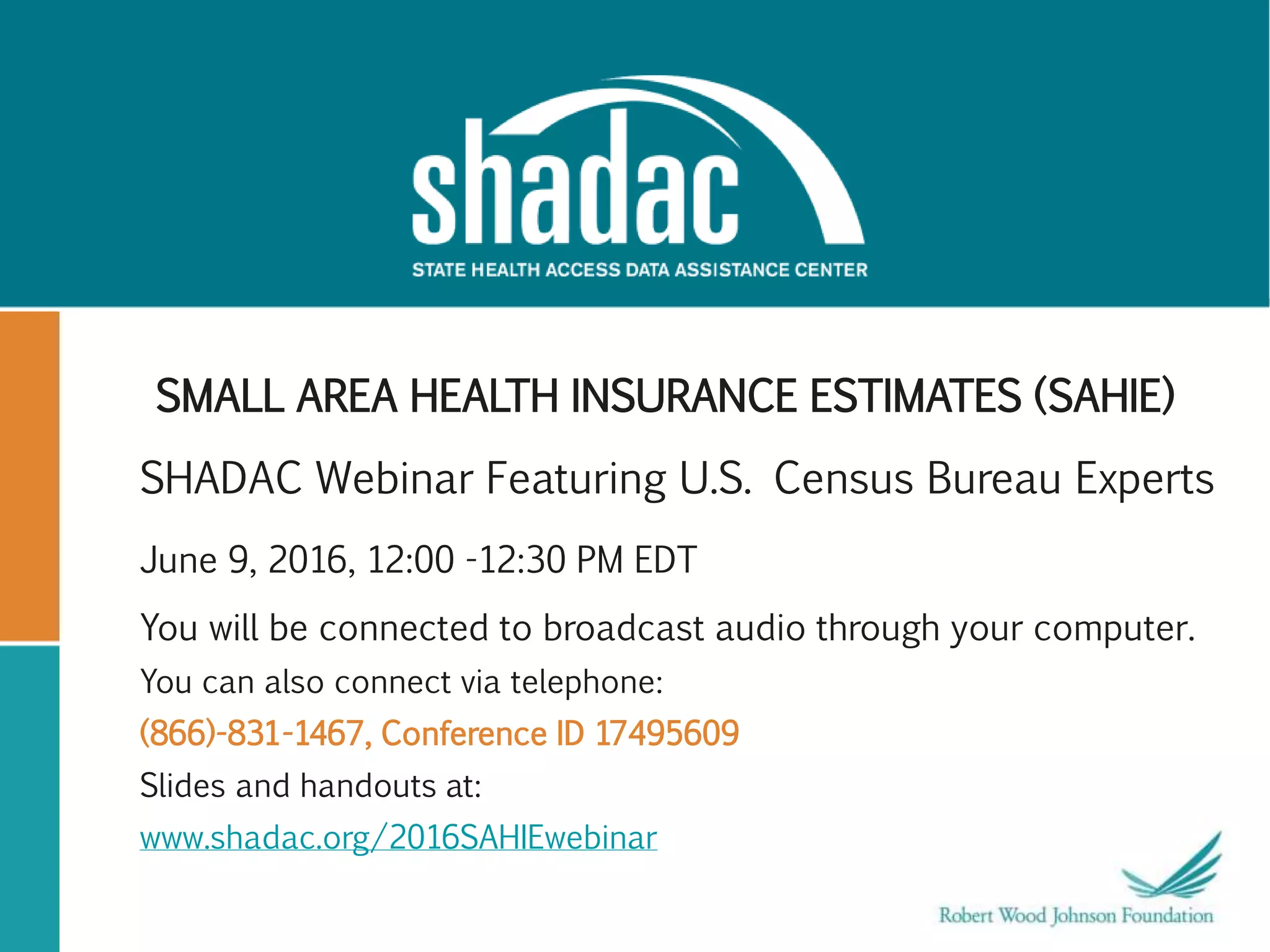 The document summarizes a webinar presented by experts from the U.S. Census Bureau on the Small Area Health Insurance Estimates (SAHIE). SAHIE provides county-level estimates of health insurance coverage across various demographic groups. The webinar discussed the 2014 SAHIE release, which incorporated more up-to-date Medicaid data and showed substantial changes in insurance rates from 2013 to 2014. The webinar also reviewed the data sources and methodology used to produce the SAHIE estimates.