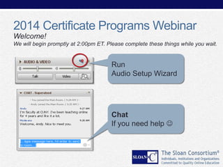 The webinar provided an overview of Sloan-C's certificate programs for online teaching. Sloan-C offers an Online Teaching Certificate program and an Advanced Certificate program. The Online Teaching Certificate includes a foundation course and three electives over 9-12 months with one-on-one mentoring to help faculty improve their online courses. The Advanced Certificate is for experienced online educators and focuses on areas like accessibility, active learning, and assessment. Both programs are led by experienced online educators and provide opportunities for professional development and networking.