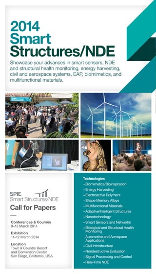 This document provides information about the SPIE Smart Structures/NDE 2014 conference to be held March 9-13, 2014 in San Diego, California. The conference will include 10 parallel conferences covering topics related to smart structures, non-destructive evaluation, health monitoring, biomimetics, electroactive polymers, sensors, and more. It will feature invited talks, contributed talks, posters, and a special presentation from the San Diego Zoo on bioinspiration. Attendees are invited to submit abstracts by August 26, 2013 and the conference will include an exhibition and awards program.