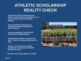 This document provides information to help student athletes navigate the college search and recruitment process. It discusses the low probability of receiving an athletic scholarship or continuing athletics beyond high school. It also outlines the differences between NCAA Divisions I, II, and III as well as tips for white and blue chip athletes on marketing themselves to coaches. Blue chip athletes tend to be highly recruited while white chips must be proactive in contacting coaches. Maintaining good grades is important to maximize college options.