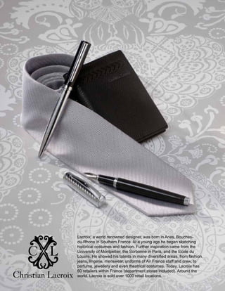 Christian Lacroix is a renowned French fashion designer born in southern France. He studied at several prominent French universities and has shown talent in many areas of design including fashion, perfume, jewelry, and costumes. Today Lacroix has over 1000 retail locations worldwide selling his designs. The document then provides product details and pricing for various Lacroix accessories, clothing, and other items.