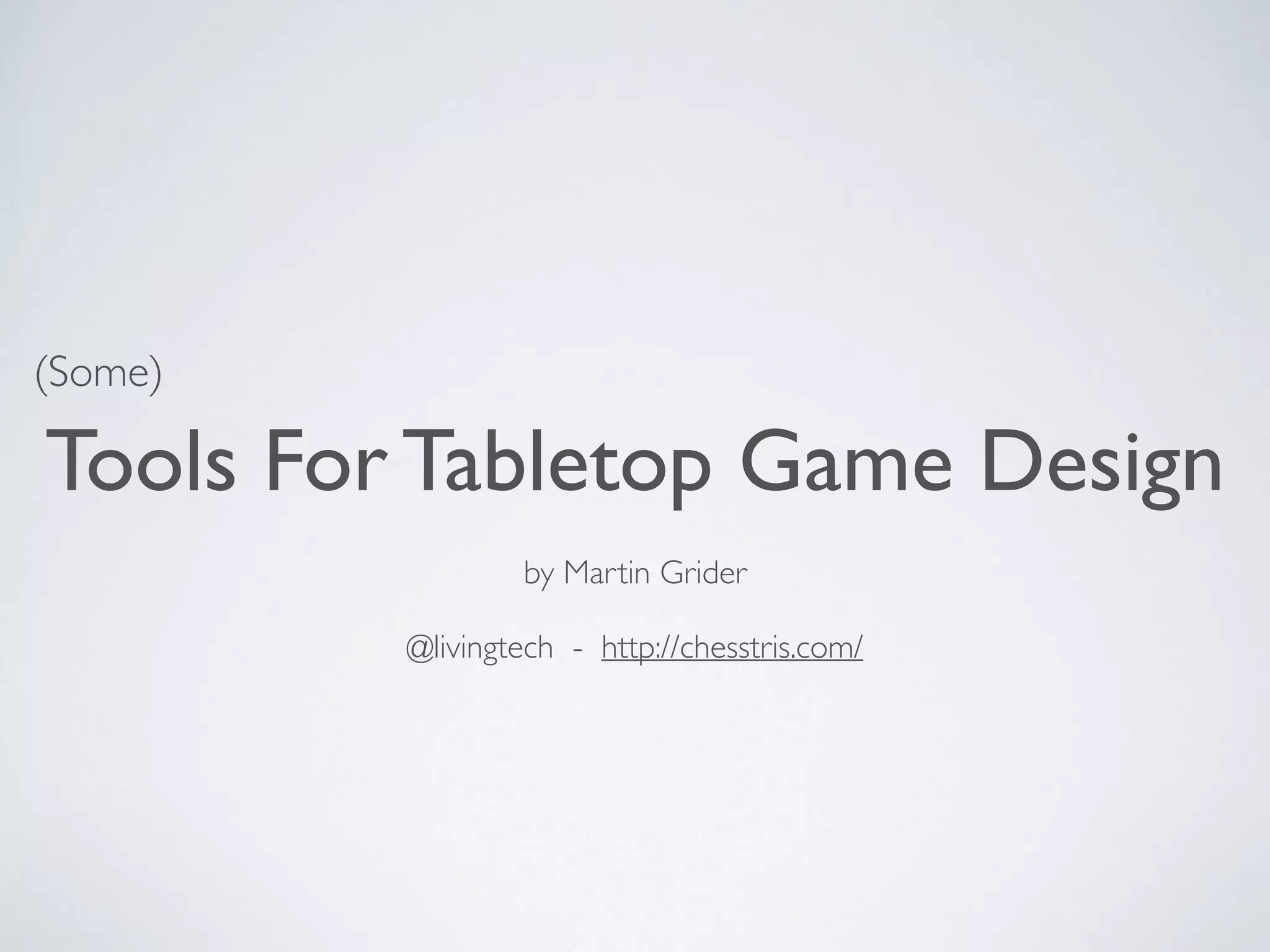 The document discusses tools for tabletop game design, specifically spreadsheets and two online tools - Playtest and Card Warden. It provides examples of how spreadsheets can be used to track game systems, components, and attributes for balancing purposes. Playtest allows importing a CSV file to generate card layouts while Card Warden facilitates playtesting digitally by shuffling, dealing and manipulating virtual decks. The document demonstrates these tools through examples from the author's games Memory Matters and Ship Deck.