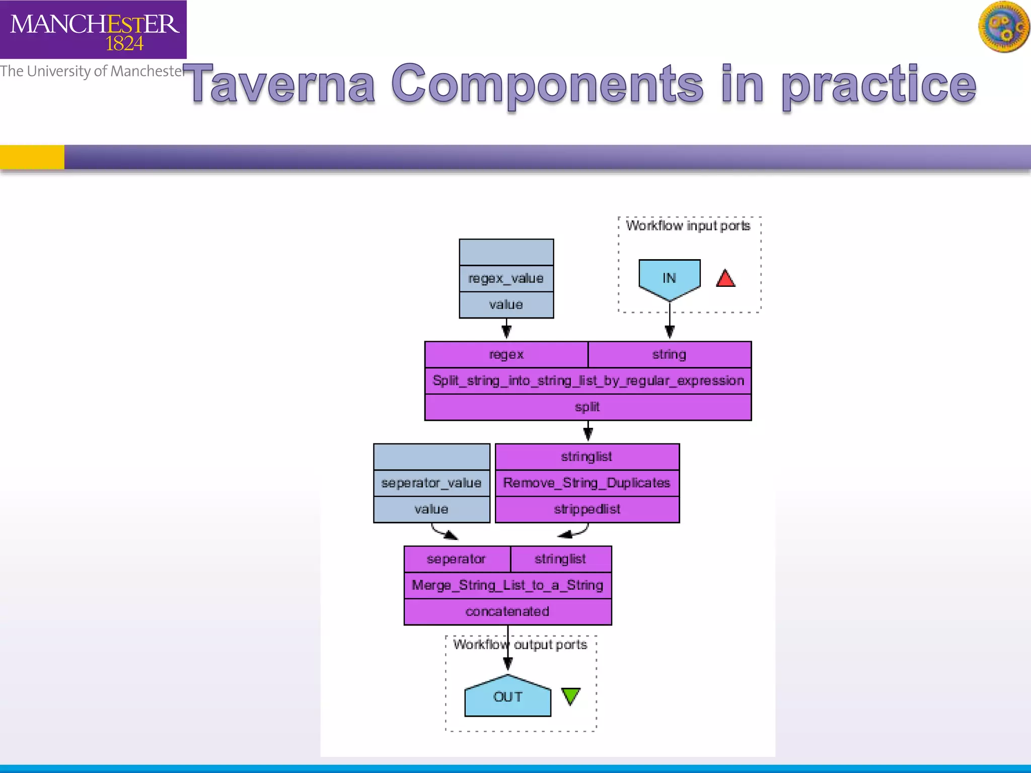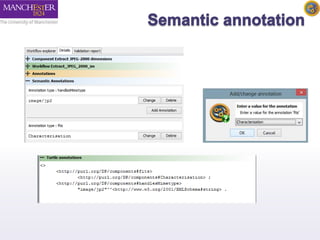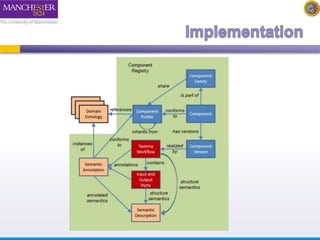 The document introduces Taverna components and their functionalities within workflows. It explains the characteristics of components, how they are created, annotated, and managed in component families, and their integration into workflows. The text outlines steps for creating components, adding them to workflows, and connecting different services efficiently.