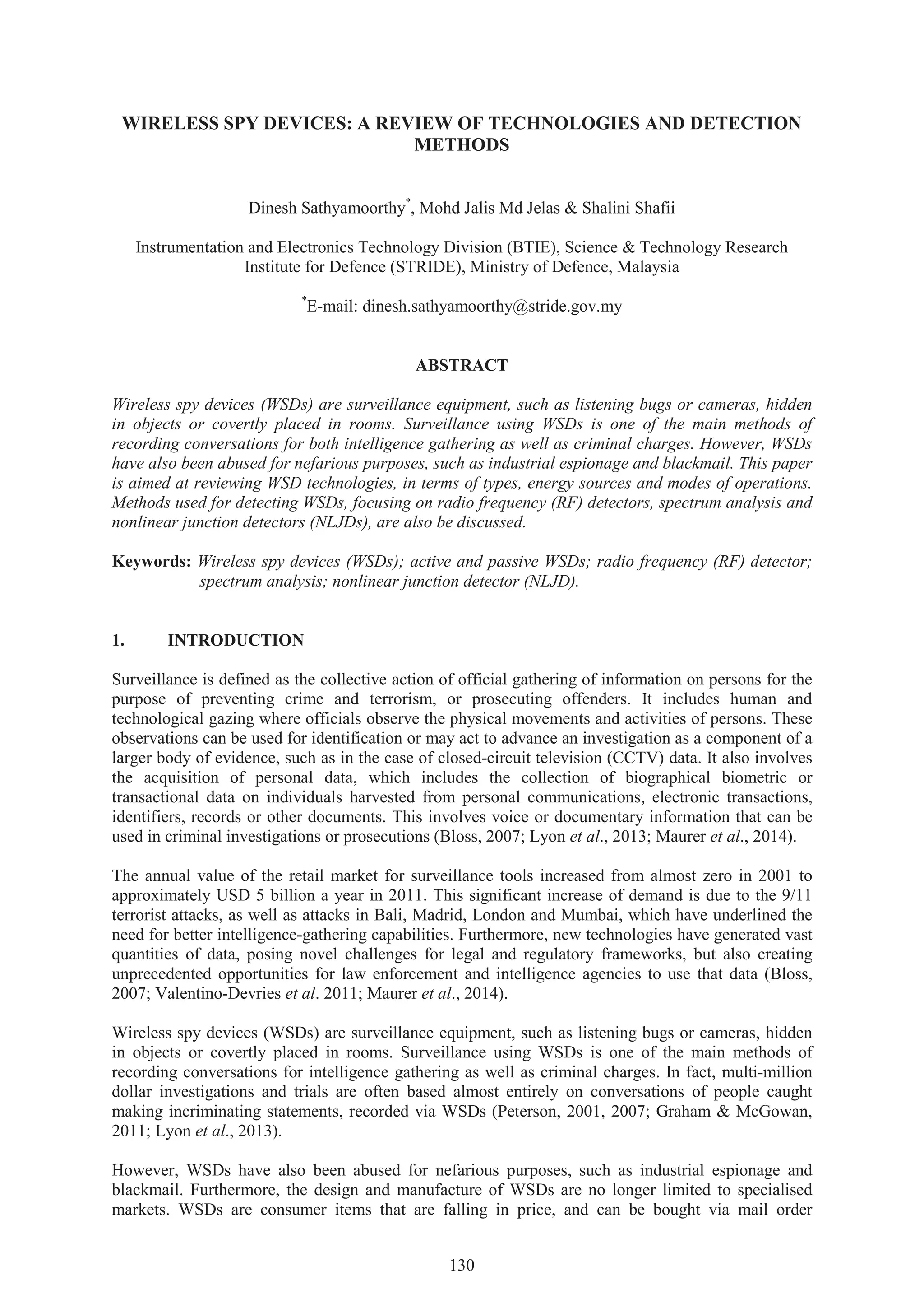This document reviews wireless spy device (WSD) technologies and methods for detecting WSDs. It discusses: