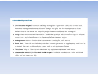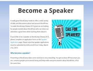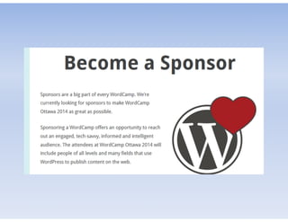 This document contains notes from a presentation given by John Parkinson on WordPress. It includes information about John, recommendations for WordPress resources like wordpress.org and wordpress.tv. It also describes WordCamp events, highlighting aspects like planning committees, speakers, and a "Happiness Bar" for live help. Tips are provided for WordPress beginners around searching forums before posting, using reputable developers, and thanking event organizers.