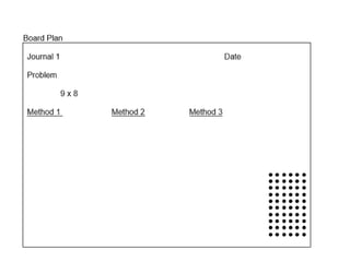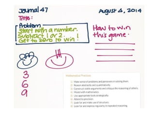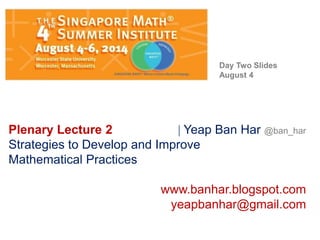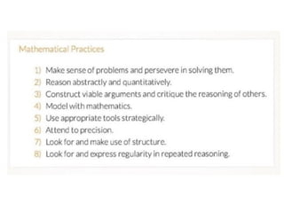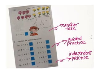 The document discusses strategies for developing and improving mathematical practices, such as using anchor tasks, collaborative structures, questioning techniques, journals, textbooks for reflection, and focusing on visualization, generalization, and number sense. It also discusses moving from concrete to pictorial to abstract representations, and using anchor tasks and challenging word problems to teach Singapore math concepts.