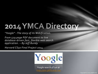 The document details the transformation of a 529-page PDF YMCA directory into a live, database-driven web search application named 'yoogle' as part of Jeff Bundy's CS50 final project in 2014. The application is currently live and accessible, with future enhancements planned including mobile search apps and expanded search functionalities. The project aims to improve accessibility to staff information and create potential revenue streams.