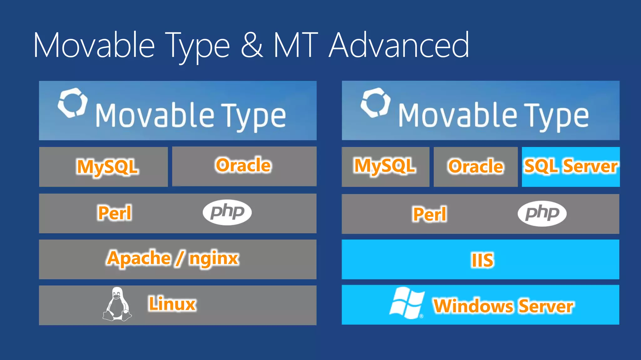 MT Advanced Oracle MySQL Perl MySQL Oracle SQL Server Perl Apache / nginx Linux IIS Windows Server