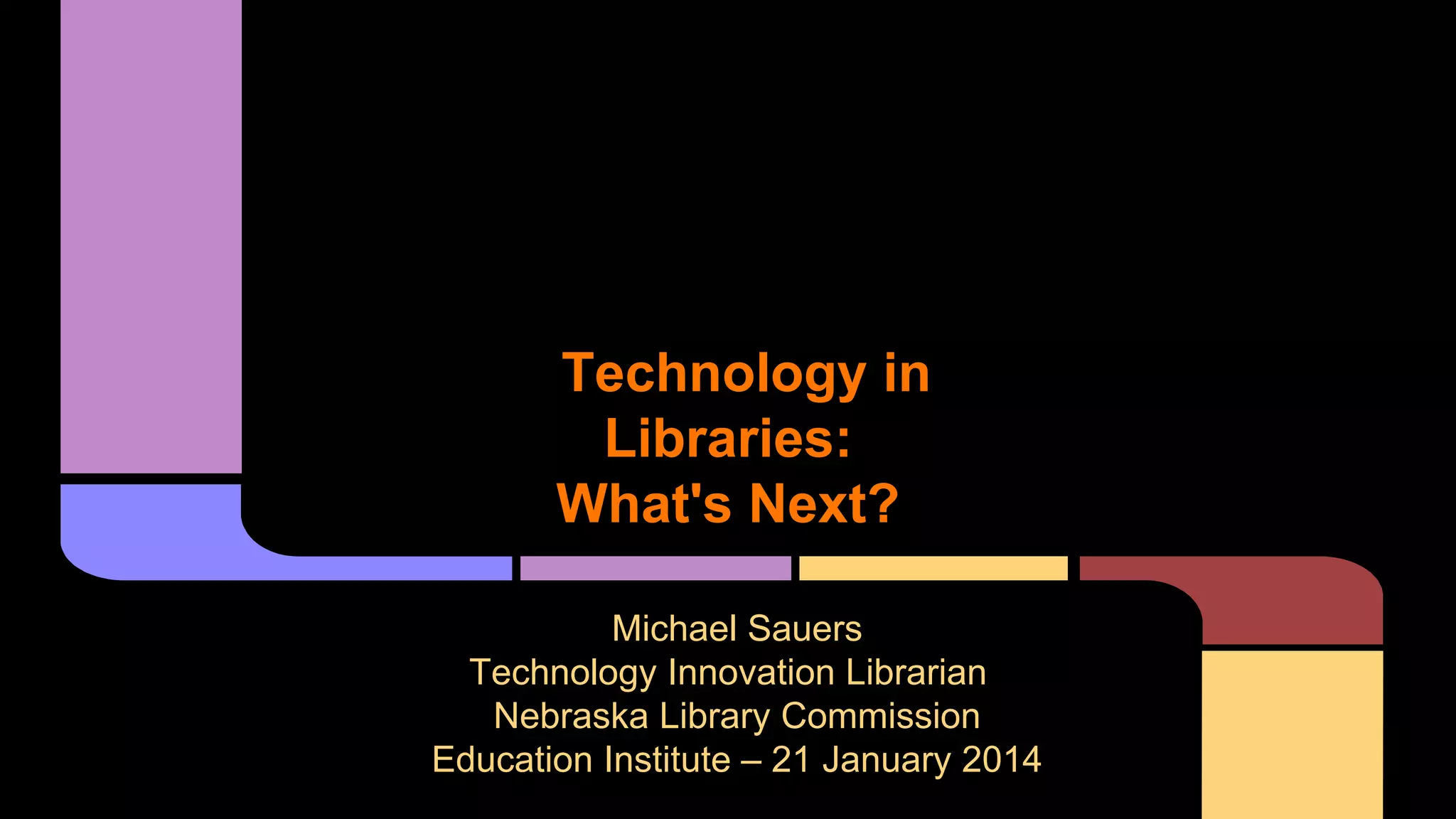 The document discusses emerging technologies and innovations relevant to libraries, including advancements in wireless communication, wearable technology, and the Internet of Things. It highlights the potential of new systems like super Wi-Fi, LiFi, and wireless electricity, which may transform library services and user experiences. The author, Michael Sauers, provides insights into how these technologies can be leveraged for improved content management and user engagement in libraries.