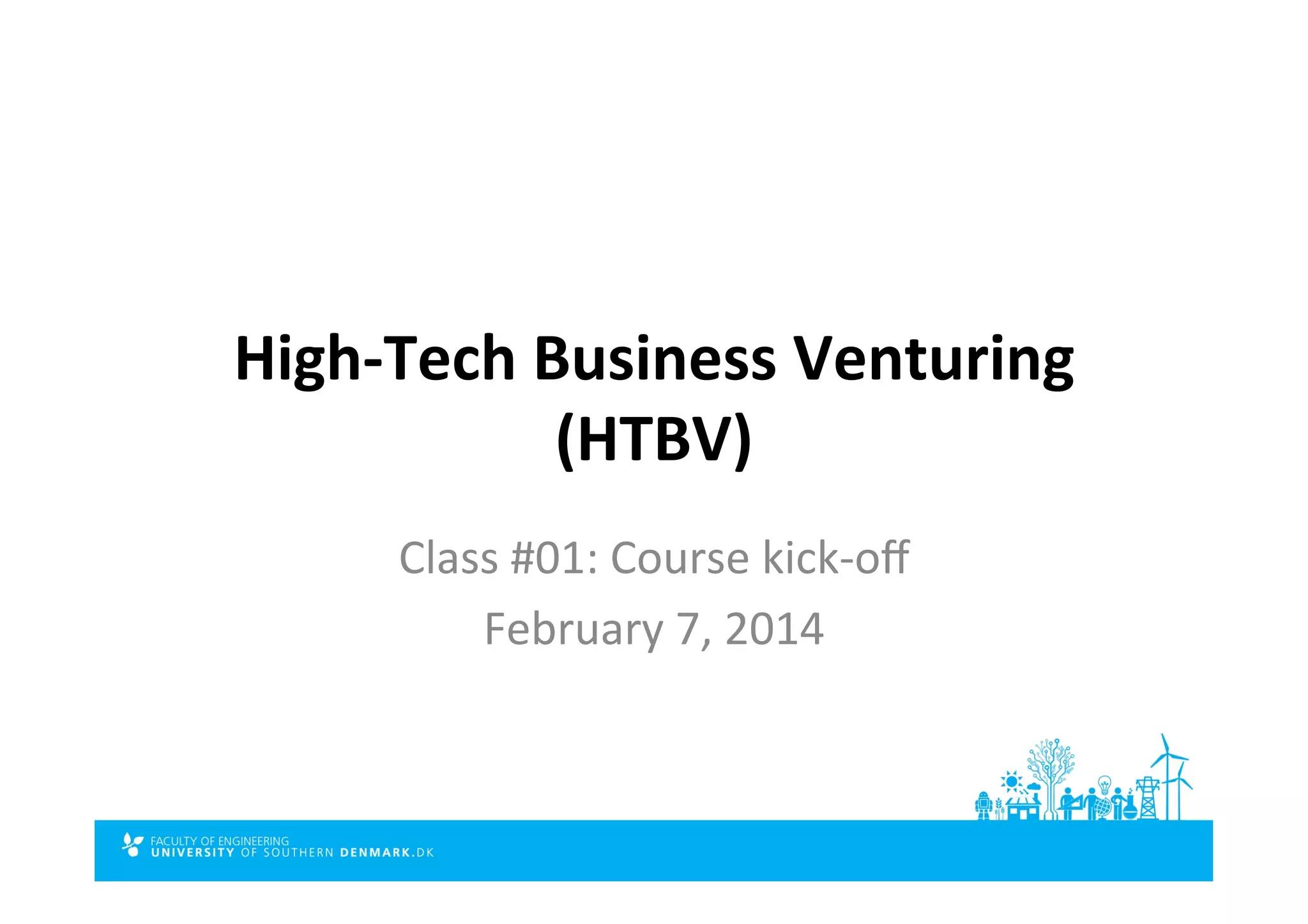 This document provides an overview and summary of the first class of the High-Tech Business Venturing course. It introduces the course topics, structure, assignments and evaluation criteria. The class covered introductions to the course syllabus and people involved, objectives of applying an entrepreneurial process to identify opportunities from new technologies, and an overview of forming student teams to pursue opportunities related to the DEAP polymer technology from Danfoss PolyPower.
