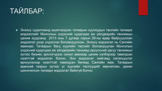 ашиглагдсан татварын хуулиудын төслийн талаарх мэдээллийг Монголын үндэсний худалдаа аж үйлдвэрийн танхимын цахим хуудсанд 2013 оны 7 дугаар сарын 29-ны өдөр байршуулсан мэдээлэл дээр үндэслэн боловсруулсан. Энэхүү мэдээлэл нь Сангийн яамнаас Татварын багц хуулийн төслийг боловсруулан Монголын үндэсний худалдаа аж үйлдвэрийн танхимд ирүүлсний дагуу танхимын зүгээс бизнес эрхлэгчдээс санал авахаар цахим хэлбэрээр тавигдсан нээлттэй мэдээлэл болно. Энэ мэдээлэл нийгэмд хэлэлцүүлэг өрнүүлэхээр нээлттэй тавигдсан бөгөөд Сангийн яам, Татварын ерөнхий газрын зүгээс уг хуулийн төслүүдийг өөрчилсөн, дахин шинэчилсэн талаарх мэдээлэл байхгүй болно.