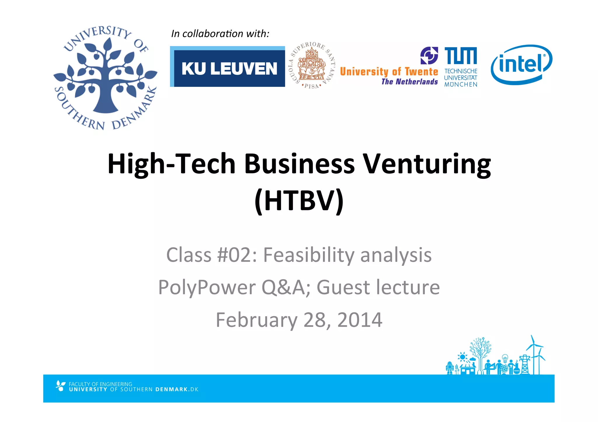 This document summarizes a class on feasibility analysis for business venturing. The class discussed assessing feasibility across various factors and characterizing demand. It included a Q&A session with Danfoss PolyPower on sensor technologies and a guest lecture from Joost Maarse on feasibility analysis and customer development. The next class was announced as a coaching session to submit a progress report and prepare for a presentation on business opportunities.