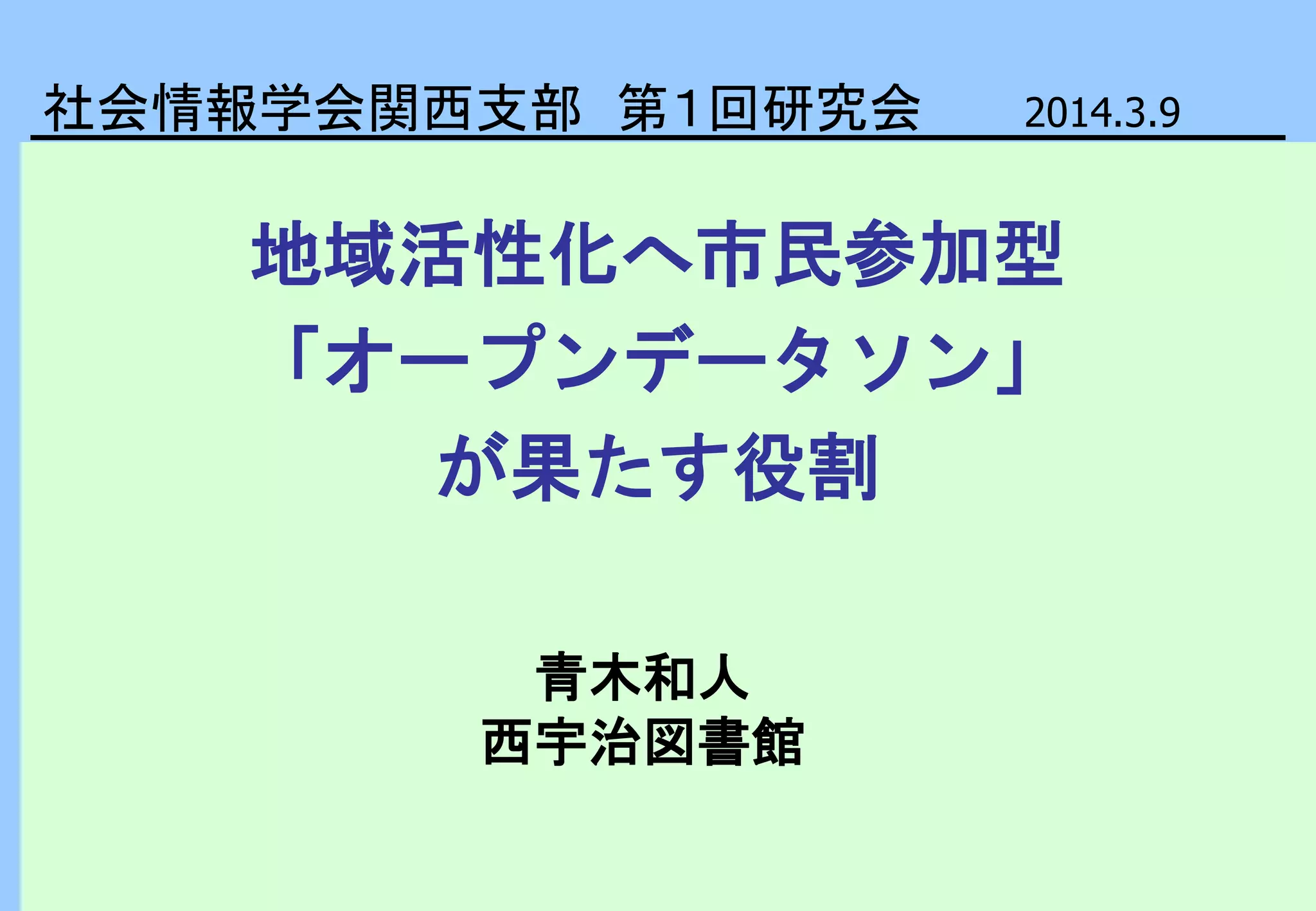 地域活性化へ市民参加型 「オープンデータソン」 が果たす役割 青木和人 西宇治図書館 社会情報学会関西支部 第1回研究会 2014.3.9