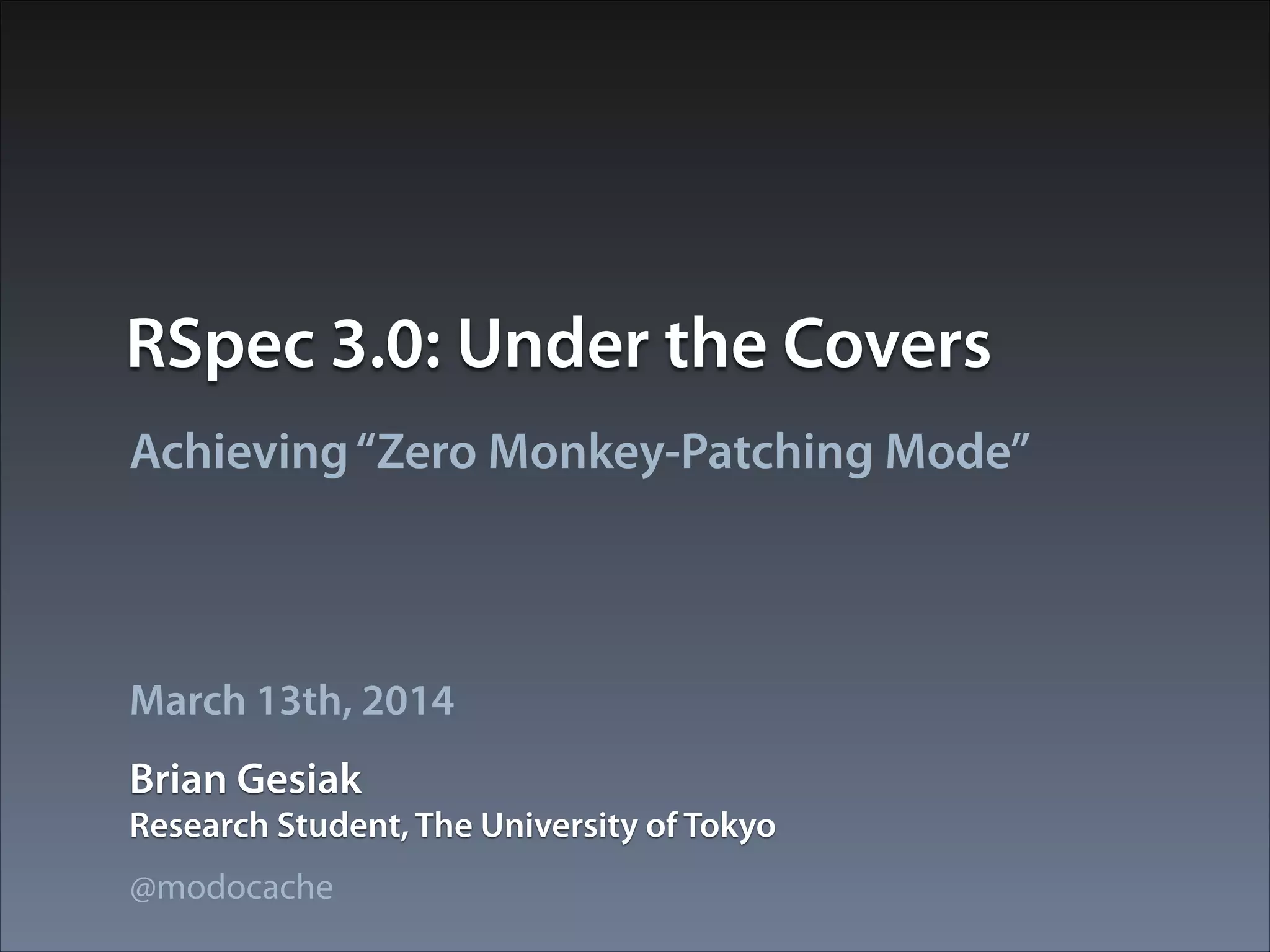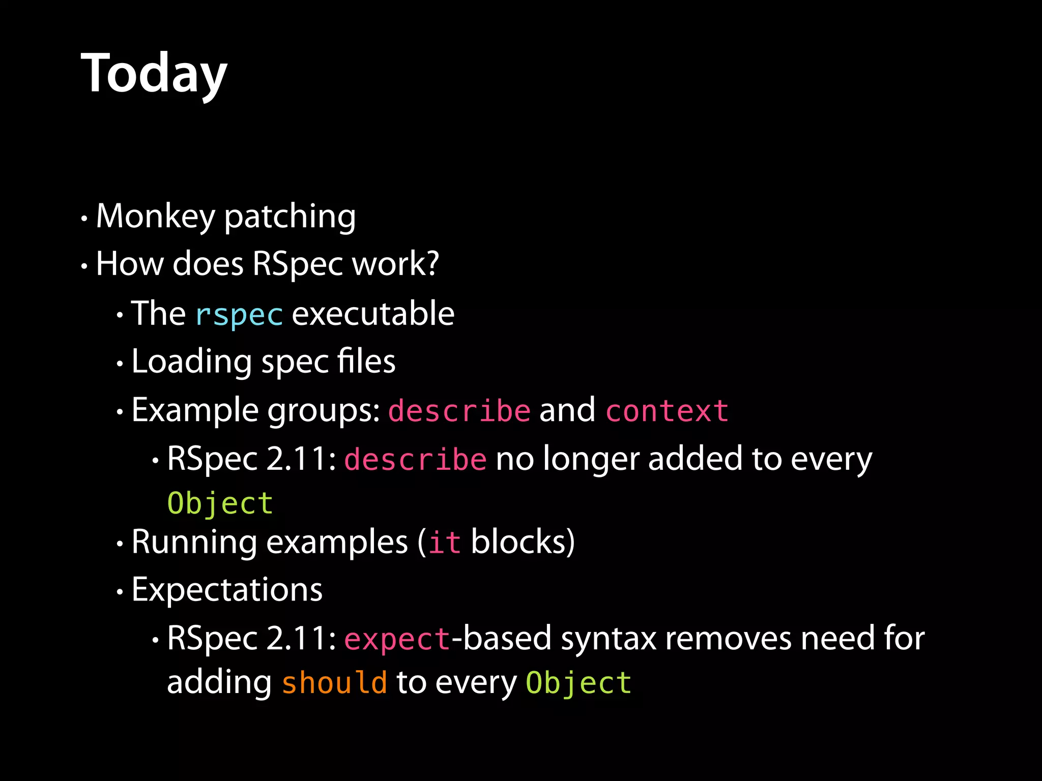 The document discusses how RSpec achieves "zero monkey patching mode" in version 3.0. It describes how RSpec previously extensively used monkey patching but has worked to reduce this in recent versions. It details how RSpec loads spec files, builds example groups and hierarchies, runs examples, and makes expectations without monkey patching core objects or classes. Key aspects covered include the rspec executable, loading files, building example groups, running examples, and the expect-based syntax.