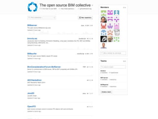 - Key projects include BIMserver.org, an open source platform for collaboration using building information modeling (BIM) data; BIM Surfer, a WebGL application for viewing BIM models in a web browser; and efforts to standardize interfaces between tools.