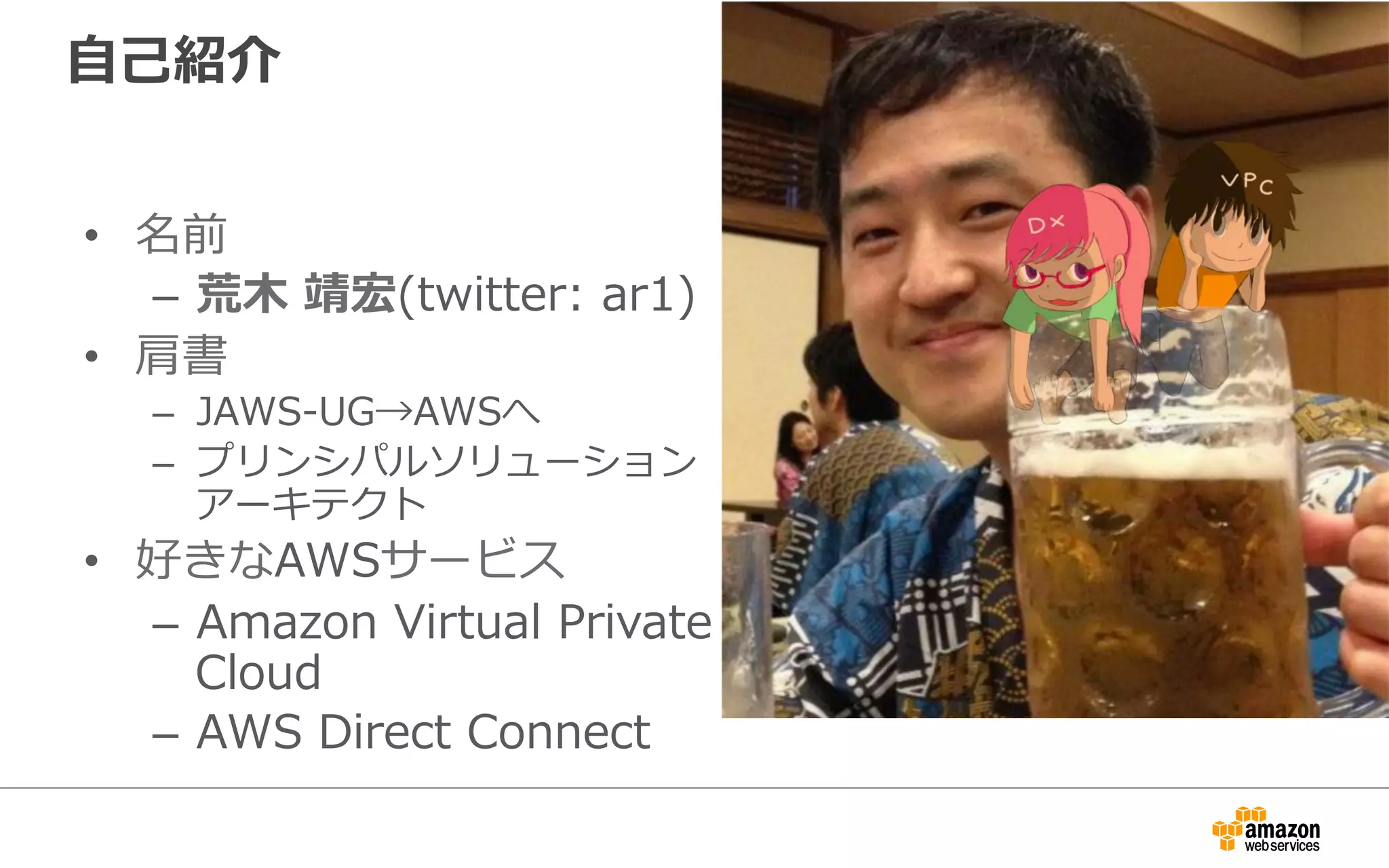 靖宏(twitter: ar1) • 肩書 – JAWS-‐‑‒UG→AWSへ – プリンシパルソリューション アーキテクト • 好きなAWSサービス – Amazon Virtual Private Cloud – AWS Direct Connect