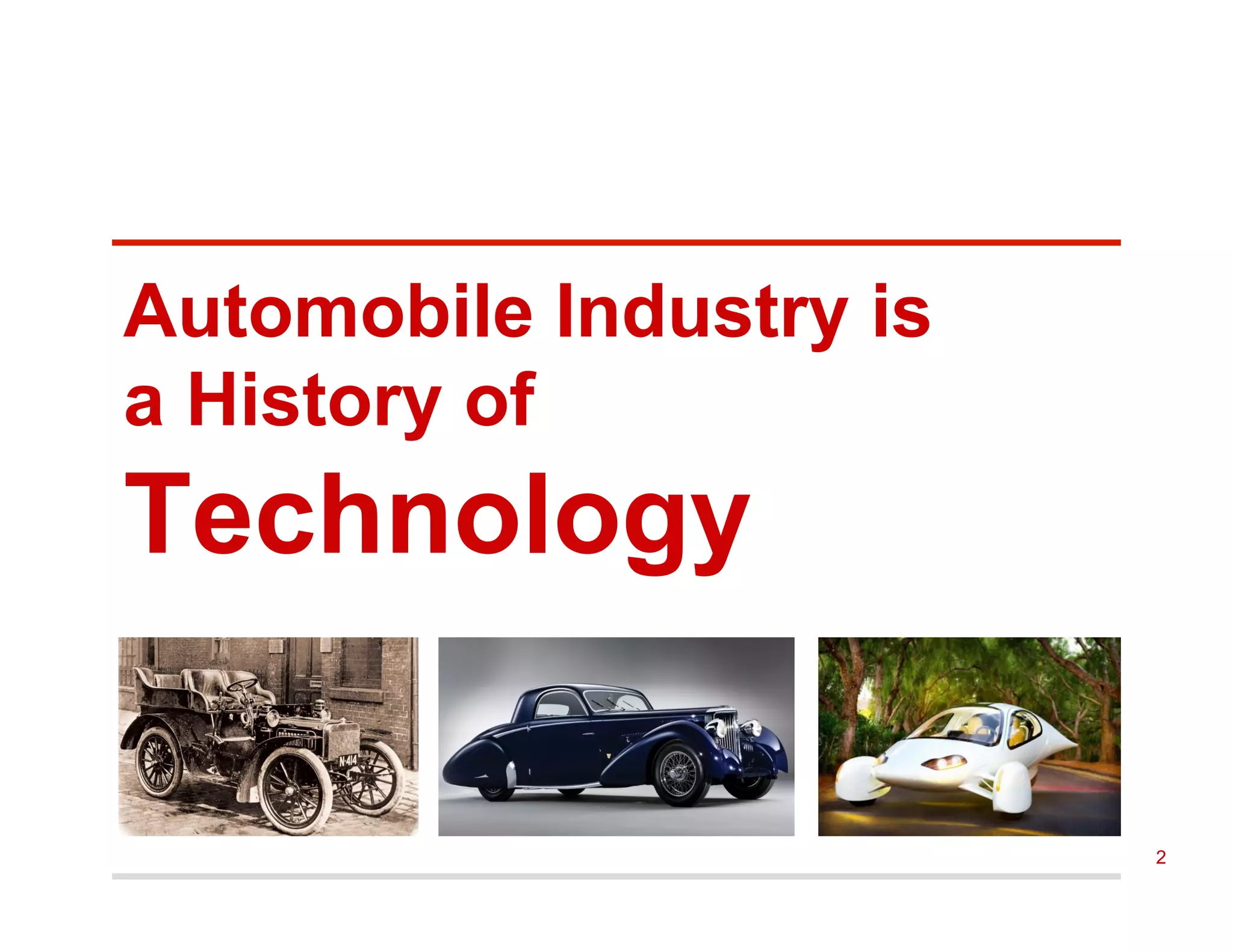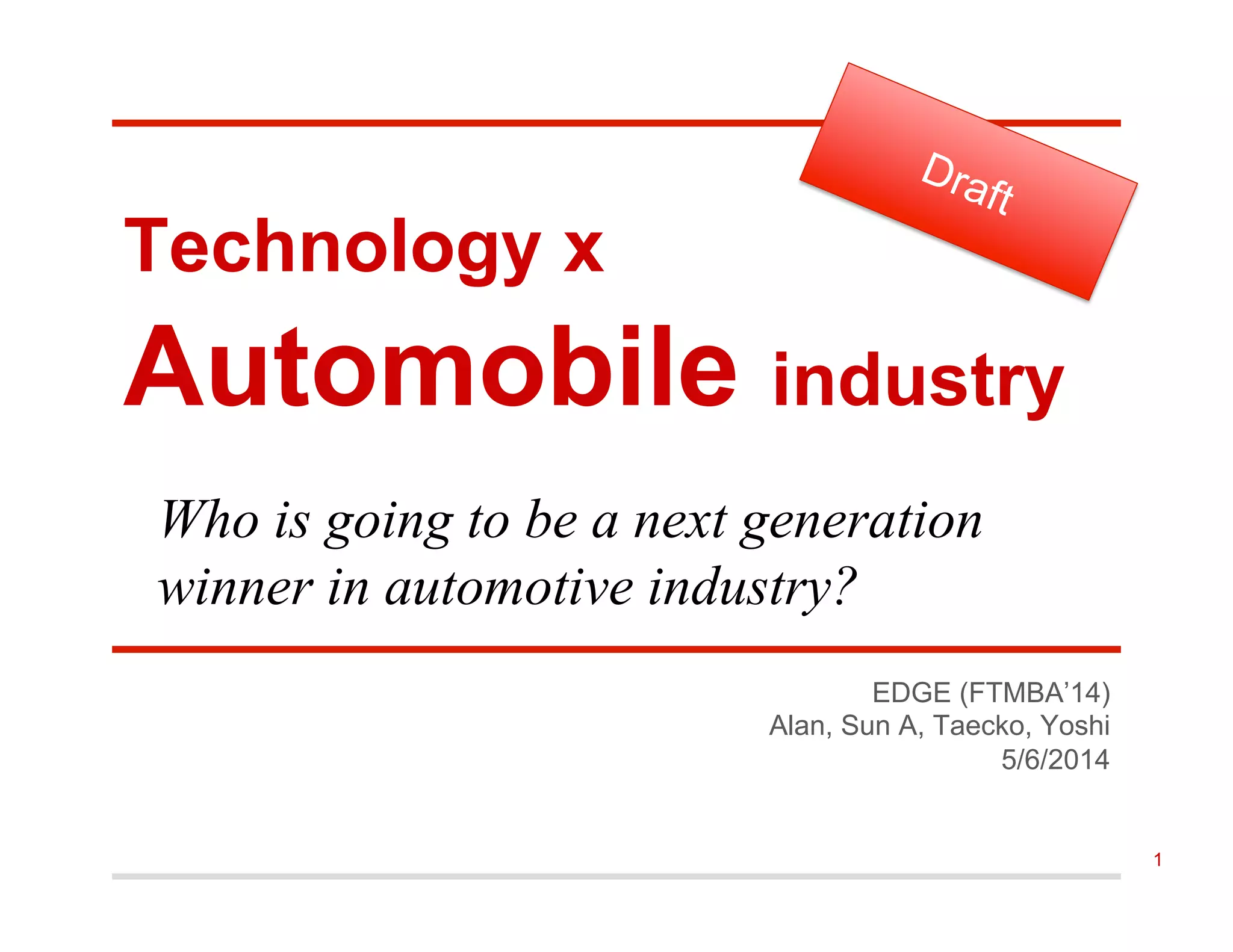 The document discusses the current state and future trends of the automobile industry. It analyzes major players like Toyota, GM, Ford, and newcomers in the space like Tesla. Emerging technologies around connectivity, autonomous driving, and electric vehicles are shifting the industry. The document recommends that incumbents develop their own operating systems and acquire software talent to control the software stack, while insurgents should leverage existing internet-based models and connectivity to transfer platforms to cars. It remains unclear whether incumbents or insurgents like Google and Apple will become the ultimate winners in this changing industry.