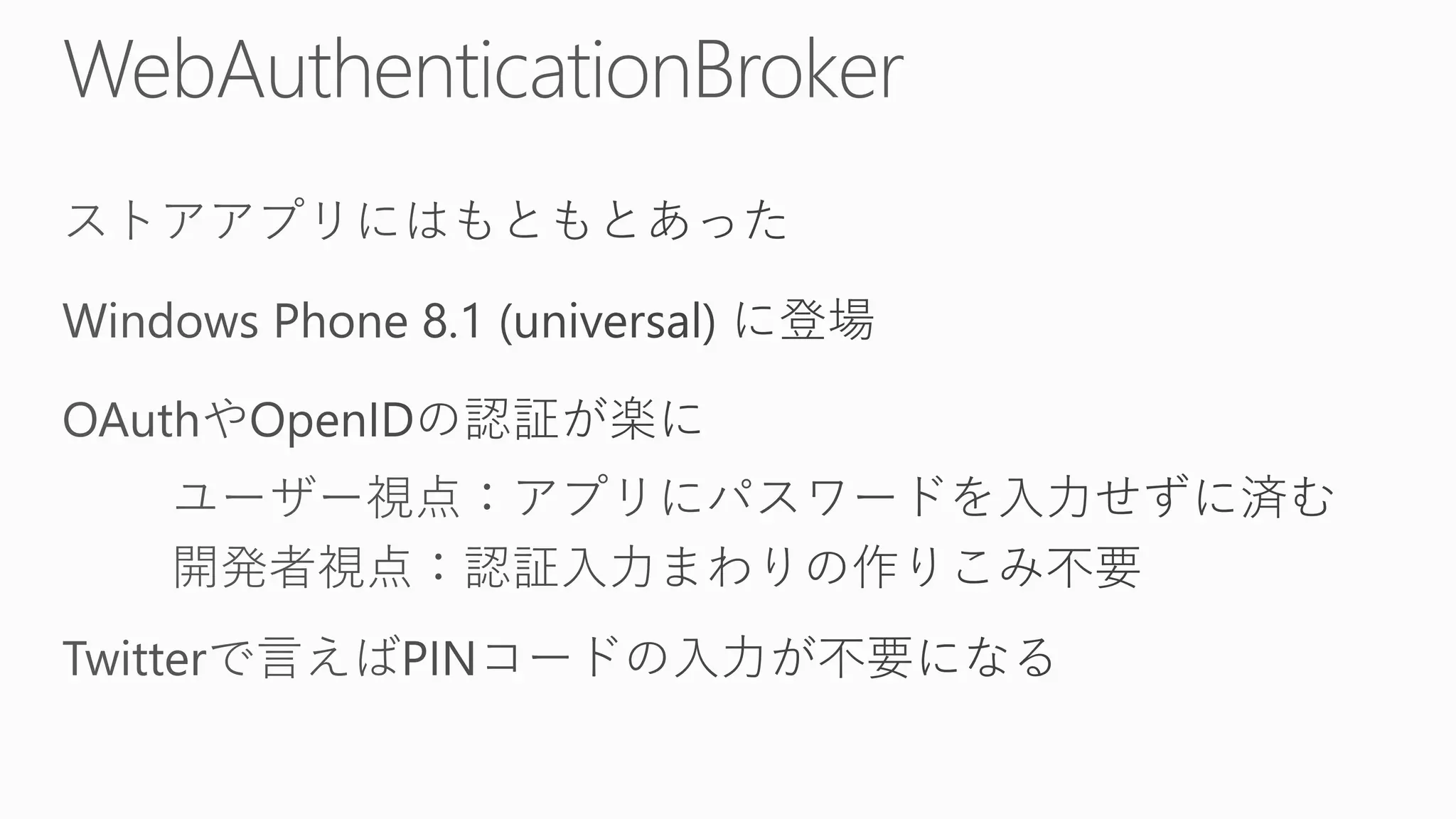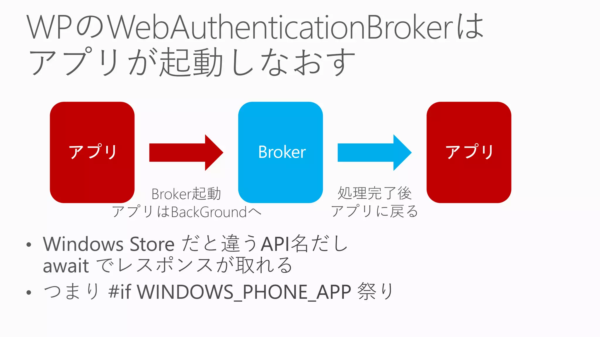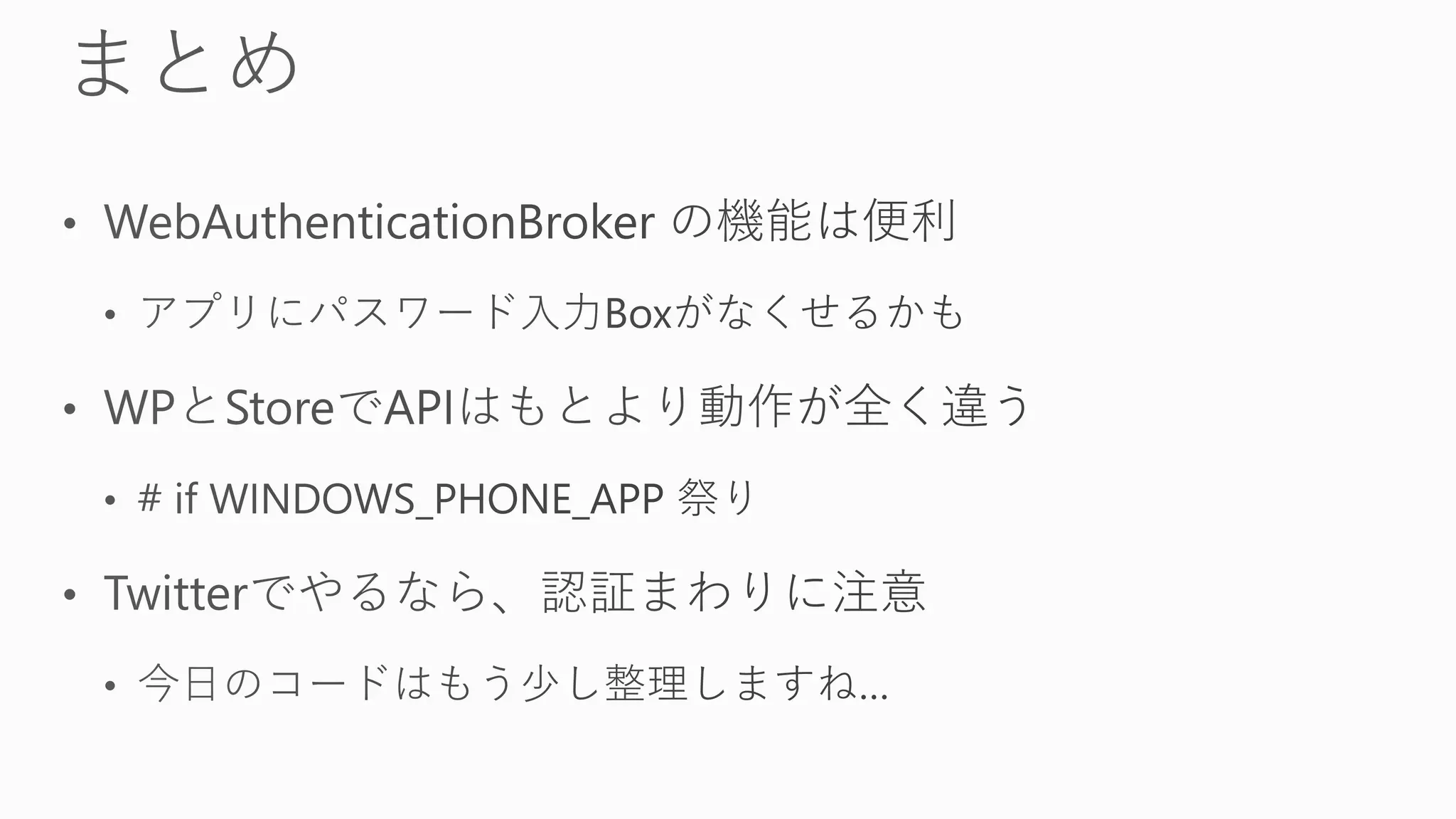 This document discusses authentication with Twitter using OAuth and the WebAuthenticationBroker. It describes getting a request token from Twitter, continuing the authentication flow after redirect, and exchanging the request token for an access token. Code snippets show initializing the broker, handling continuation events, building OAuth parameters, and making the request to get the access token.