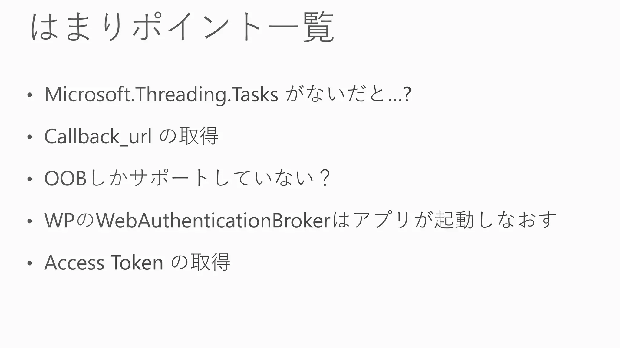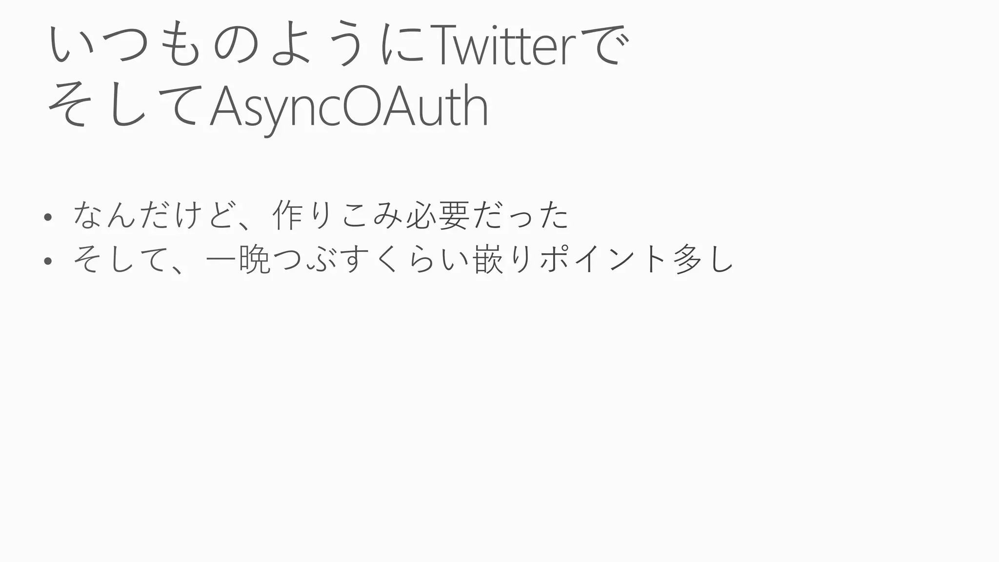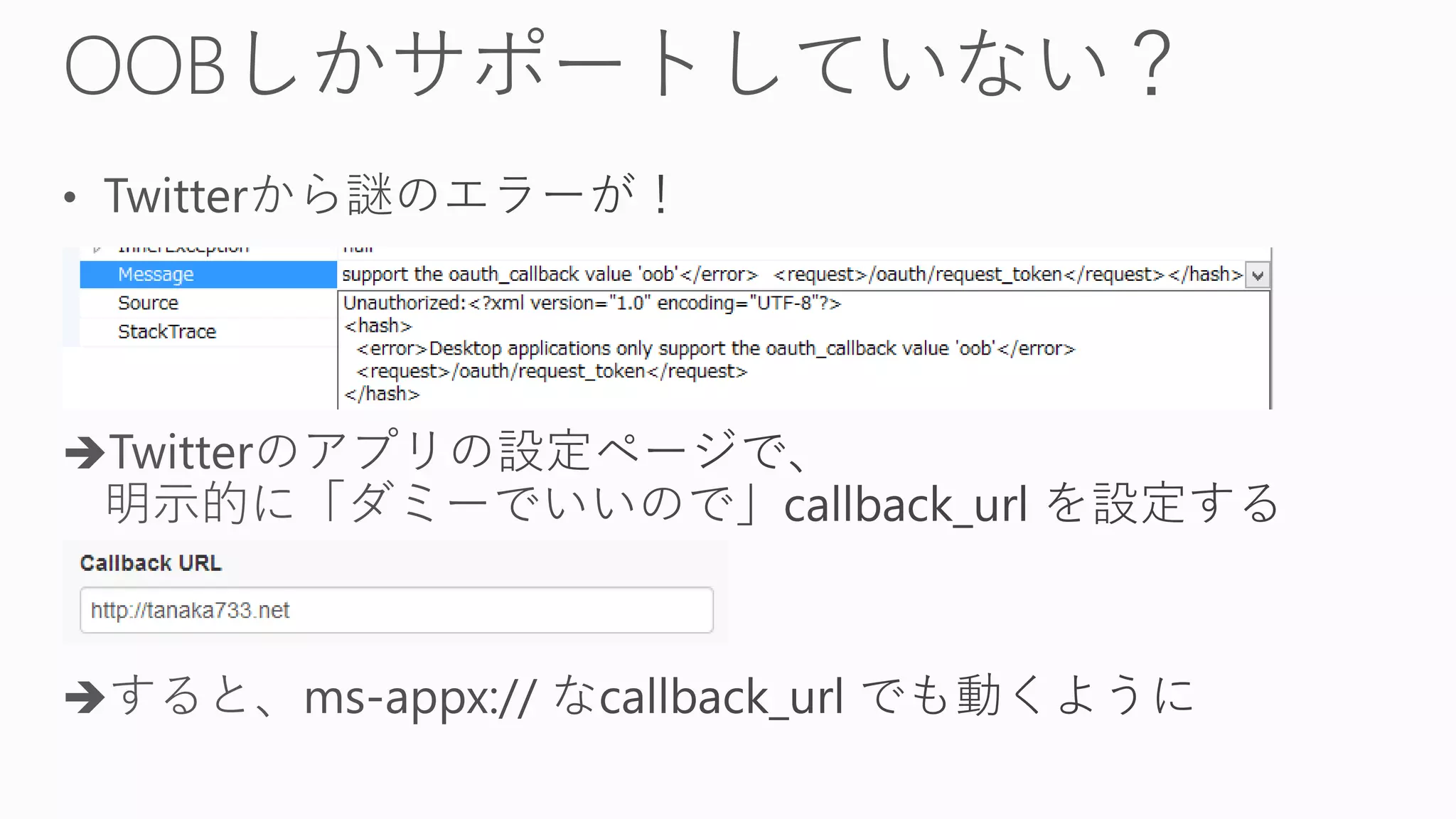 This document discusses authentication with Twitter using OAuth and the WebAuthenticationBroker. It describes getting a request token from Twitter, continuing the authentication flow after redirect, and exchanging the request token for an access token. Code snippets show initializing the broker, handling continuation events, building OAuth parameters, and making the request to get the access token.