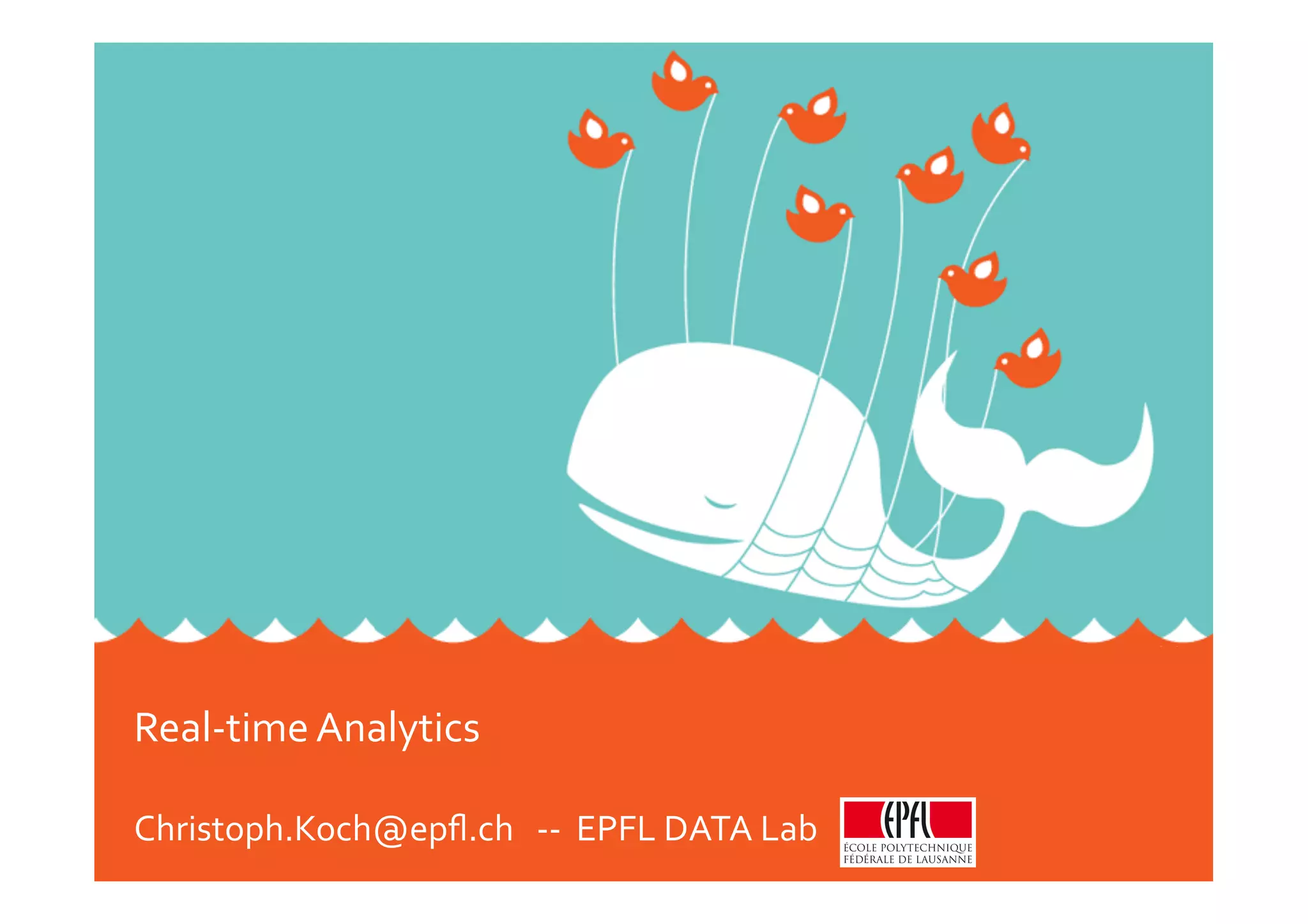 The document discusses the challenges and strategies in real-time analytics on big data, emphasizing the importance of velocity and volume. It highlights the limitations of current computational architectures and the failure of Moore's Law, proposing incrementalization, small data approaches, and parallelization as potential paths to improve performance. Additionally, it introduces concepts like ripple joins and incremental view maintenance for efficient data processing in dynamic environments.