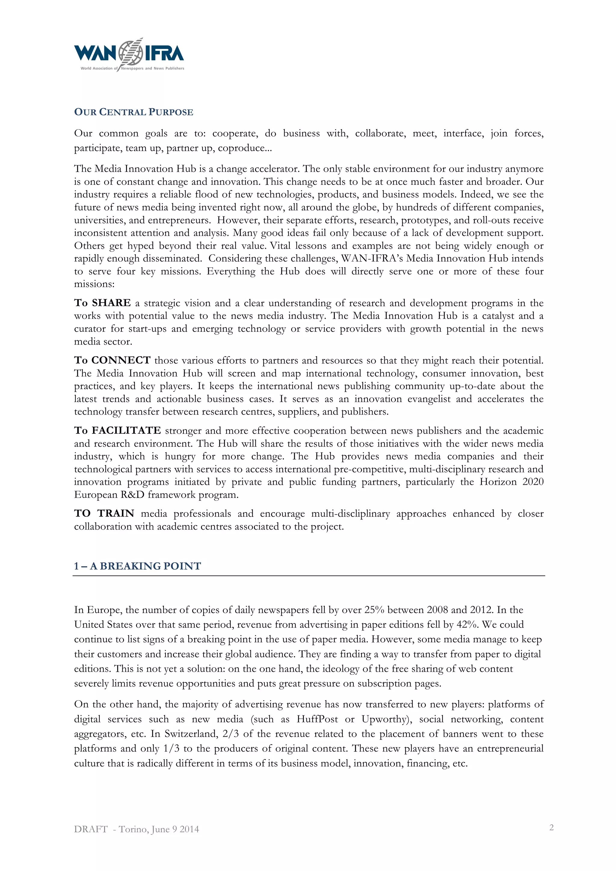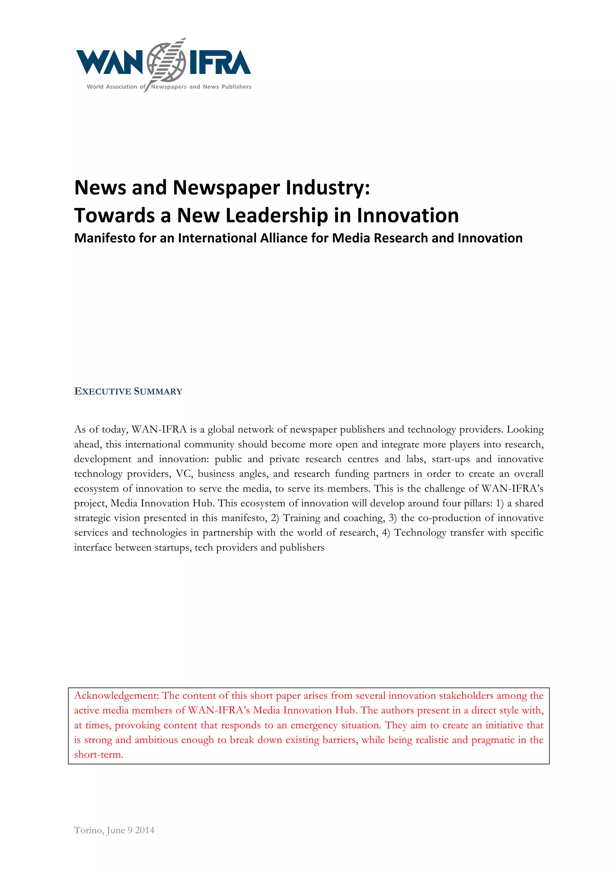 The document outlines a manifesto for an international alliance focused on innovation within the newspaper and media industry, primarily led by WAN-IFRA. It stresses the need for collaboration among various stakeholders, including publishers, technology providers, and academic institutions, to establish an ecosystem that fosters research, development, and innovation. Key initiatives include a media innovation hub centered on strategic vision, training, co-production of services, and technology transfer to address the industry's rapid evolution and financial challenges.