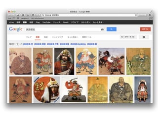 戦国武将マップ作成の作業内容 • Wikipediaから戦国時代の武将をリストアップ • Wikipediaの各武将ページから武将の画像、年代、 場所を取得。画像がない場合は、他サイトからラ イセンスの有効な画像を探す •