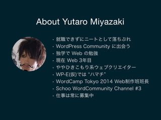 Community に出会う • 独学で Web の勉強 • 現在 Web 3年目 • ややひきこもり系ウェブクリエイター • WP-E(仮)では ハマチ • WordCamp Tokyo 2014 Web制作班班長 • Schoo WordCommunity Channel #3 • 仕事は常に募集中 About Yutaro Miyazaki
