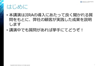 Inc. All rights reserved. はじめに • 本講演はJIRAの導入にあたって良く聞かれる質 問をもとに、弊社の顧客が実践した成果を説明 します • 講演中でも質問があれば挙手にてどうぞ! 1
