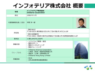 1998 年年 9 ⽉月 代表取締役社⻑⾧長 / CEO 平野 洋⼀一郎郎 所在地 【東京本社】 〒140-‐‑‒0014 東京都品川区⼤大井1丁⽬目47番1号 NTビル10F 【⻄西⽇日本事業所】 〒531-‐‑‒0001 ⼤大阪府⼤大阪市北北区梅⽥田2丁⽬目4番13号 阪神産經桜橋ビル3F 資本⾦金金 11億3,846万6,500円 事業内容 ・ソフトウェア開発・販売 ・製品サポート ・製品コンサルティング ・製品トレーニング グループ会社 ・Infoteria America Corporation ・亿福天(杭州)信息科技有限公司 ・樱枫天(上海)贸易易有限公司 ・Infoteria Hong Kong Limited 所属団体 ・MIJS ・XML技術者育成推進委員会