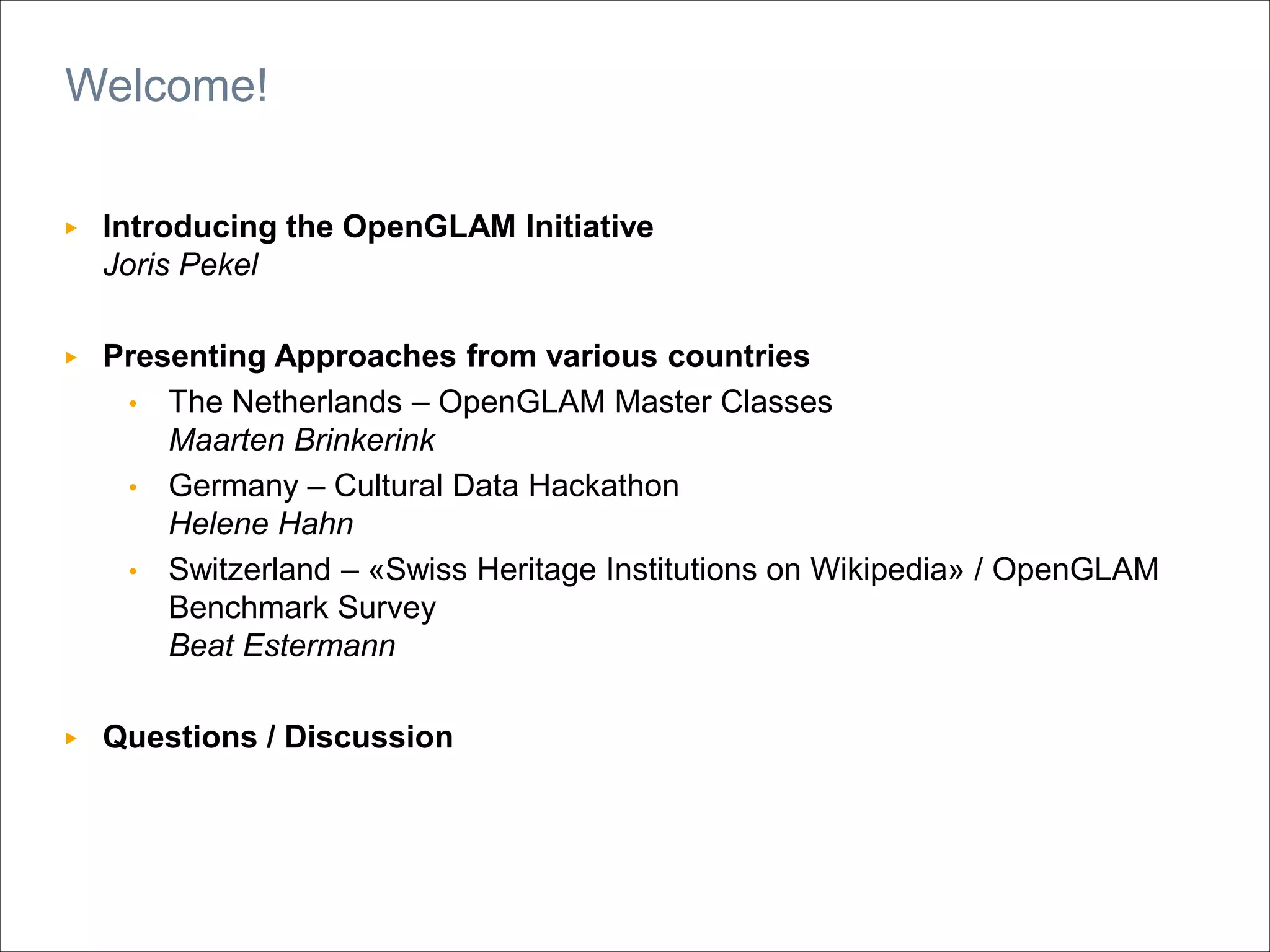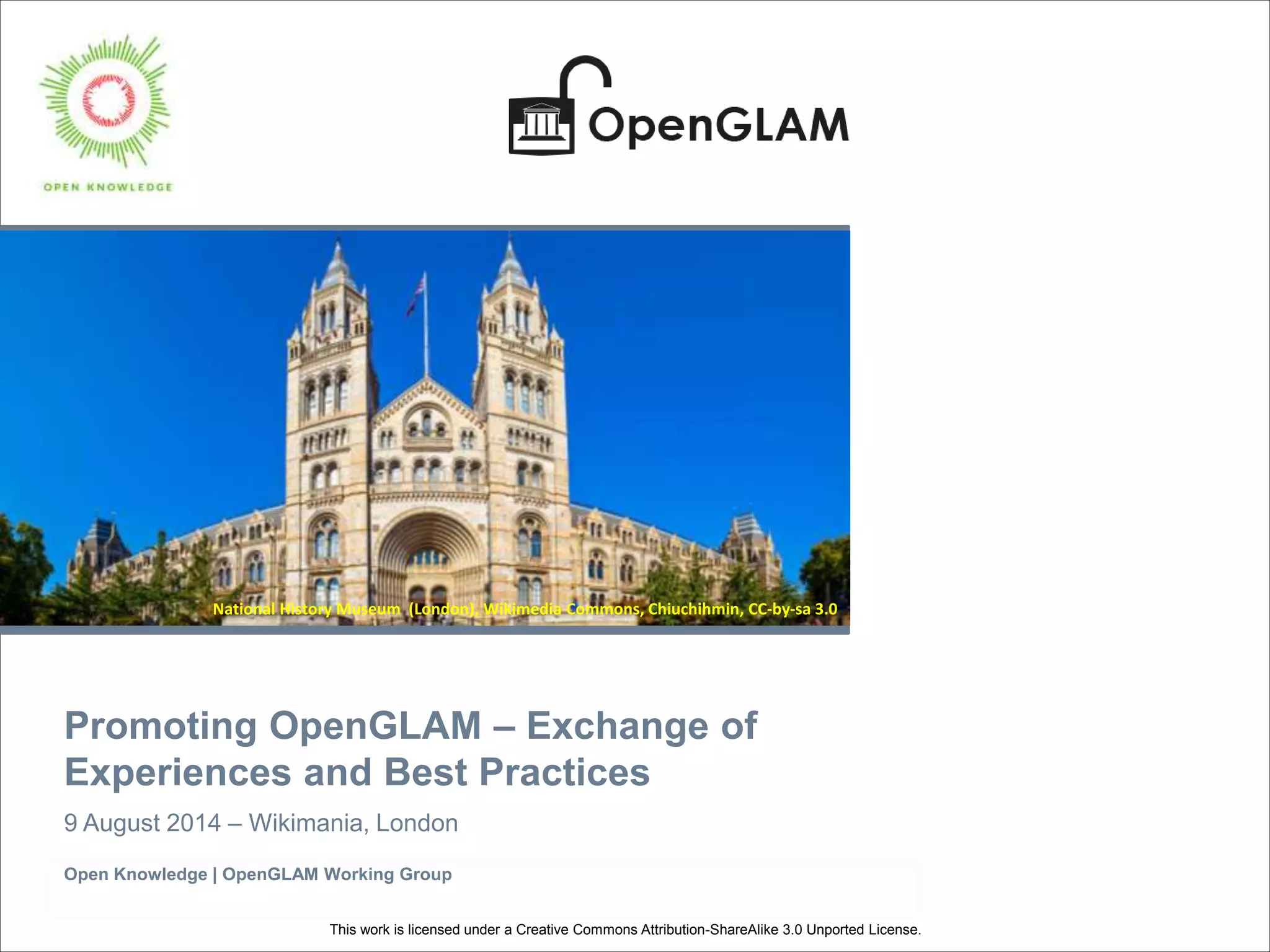 The document summarizes presentations from the OpenGLAM Working Group at Wikimania 2014 in London. It describes initiatives in several countries to open cultural data from galleries, libraries, archives, and museums (GLAMs) and promote best practices. The Netherlands program includes OpenGLAM masterclasses to train GLAMs on open data. Germany's program included a cultural data hackathon. Switzerland conducted an OpenGLAM benchmark survey of heritage institutions and a pilot project encouraging institutions to contribute to Wikipedia.