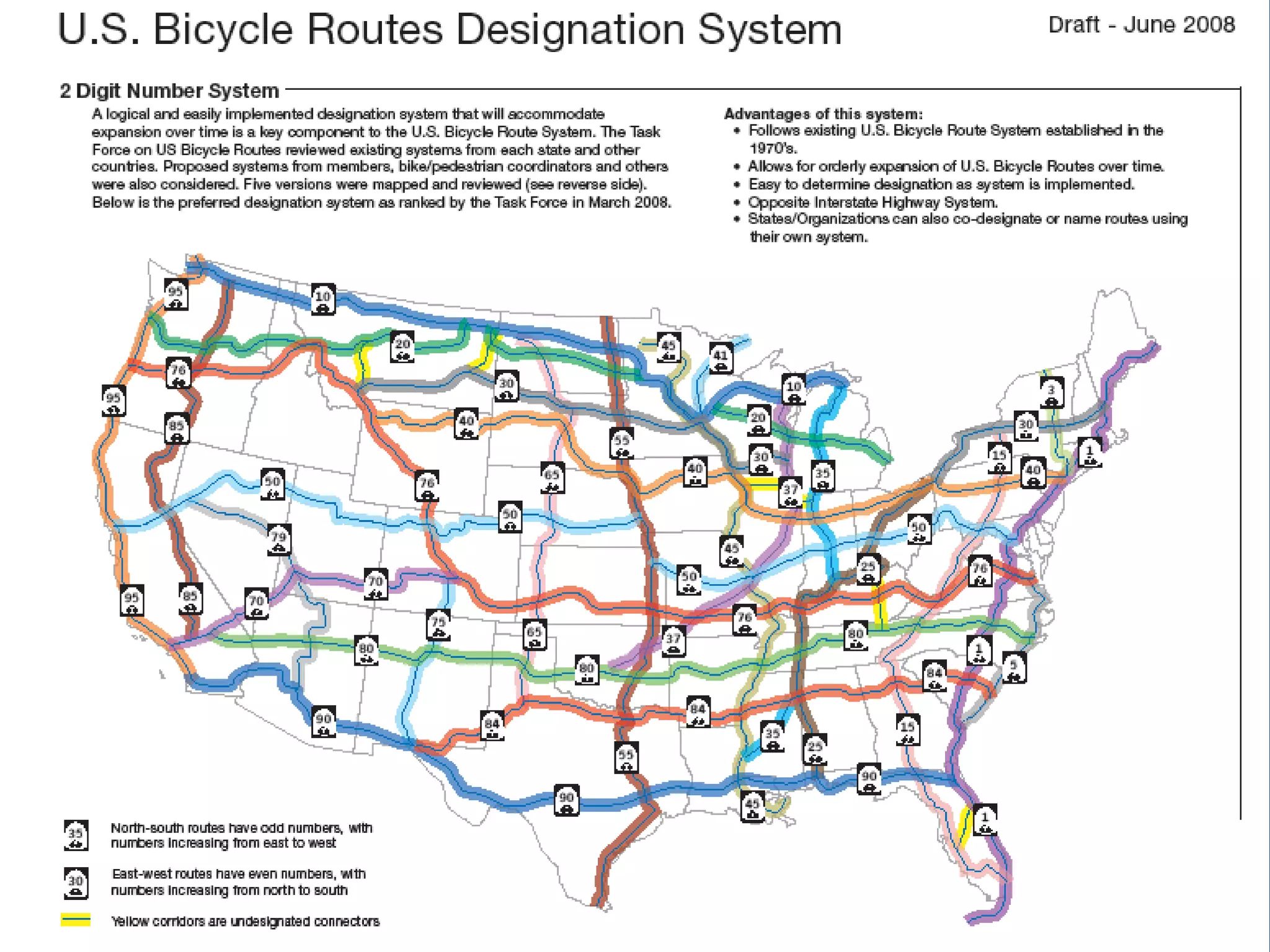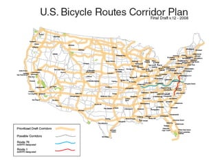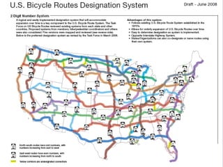 The document outlines the U.S. Bicycle Route System (USBRS) and emphasizes its role in promoting bicycle tourism and economic benefits from cycling. It details the history, current statistics, and best practices for developing a coordinated national system of bike routes, alongside the demographic and spending habits of bicycle travelers. The document also highlights successful case studies and plans for future route implementations across various states.