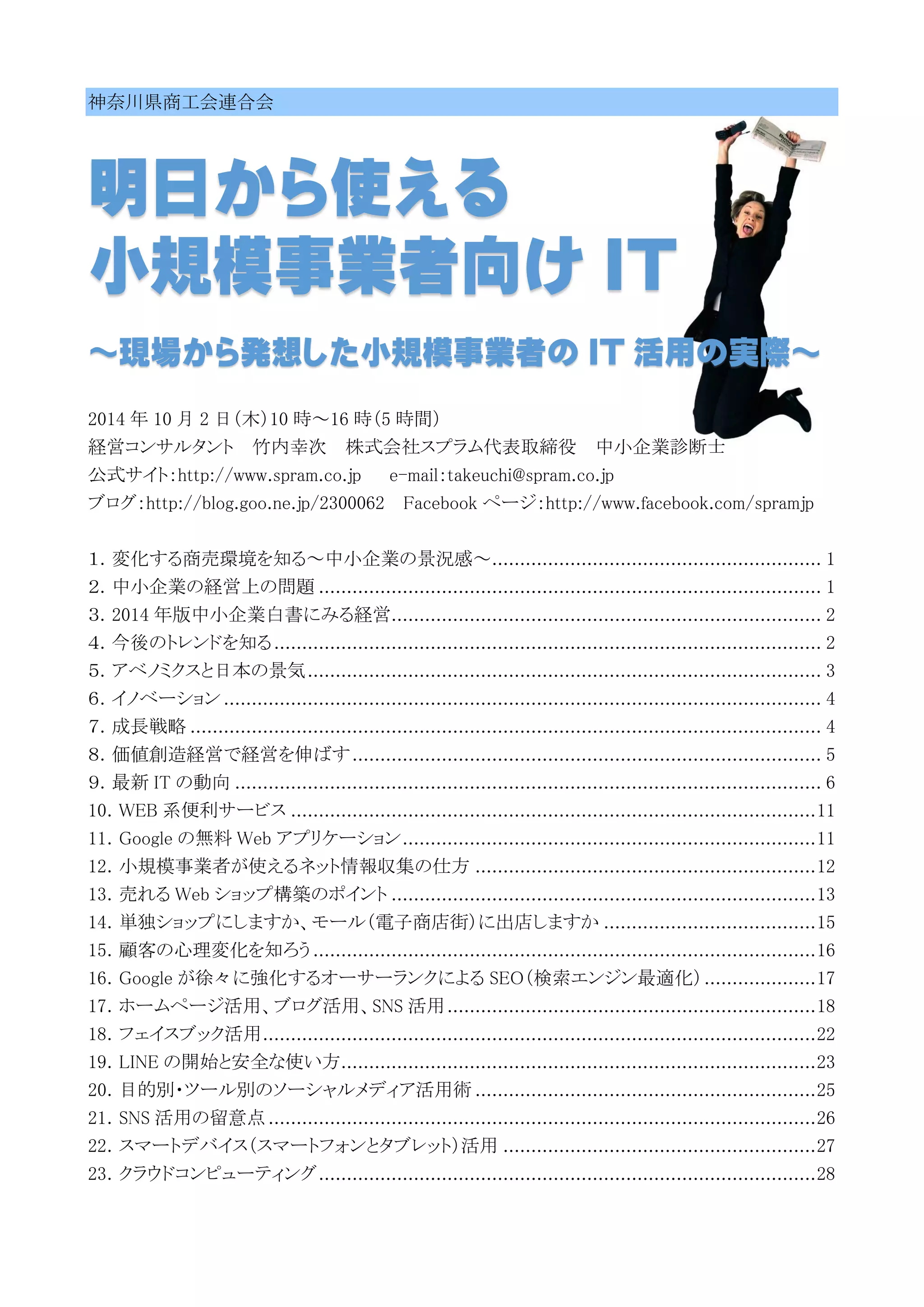 中小企業診断士の竹内幸次です。今日は神奈川県商工会連合会経営指導員研修会で講演「明日から使える小規模事業者向けIT~現場から発想した小規模事業者のIT活用の実際~」を、川崎市産業振興財団かわさき起業家塾で講演「資金調達(補助金・融資)と損益計画」を行います。