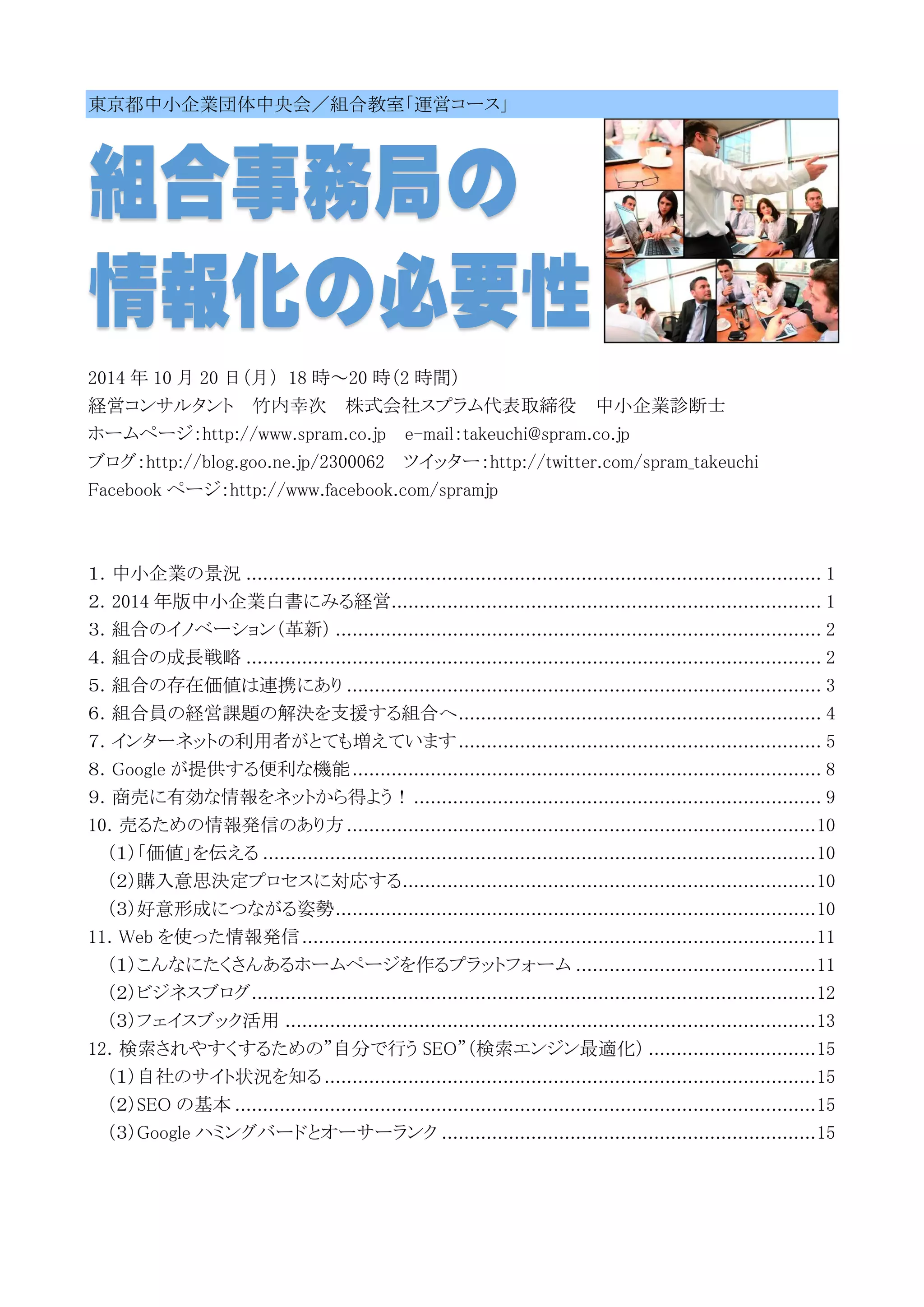 【組合情報化講演のレジュメ】 中小企業診断士の竹内幸次です。10月20日に講演「組合事務局の情報化の必要性」を東京都中小企業団体中央会組合教室「運営コース」で行います。只今レジュメが完成しました。皆様ぜひ参加ください!