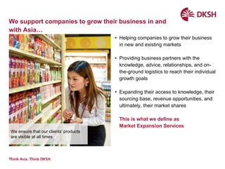 DKSH is the number 1 provider of market expansion services focused on Asia, with 150 years of experience in the region. They help companies grow their business in new and existing Asian markets through providing knowledge, advice, relationships, and logistics support across four specialized business units. DKSH has over 27,000 employees serving more than 10,000 clients in over 75 countries.