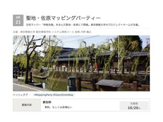既に充実していますか? Bing航空写真が 高解像度配信されていますか? GPS端末を お持ちですか? PCマッピング at OSMベースキャンプ Pushpin OSMTracker アームチェア マッピング リアルタイム マッピング 紙地図 マッピング 既存のデータを 提供してくれる組織が ありますか? No Yes Yes Yes No No No Yes ※スマホを含む Yes (iOS) Yes (Android) No Yes ※観光マップ、バリアフリーマップ、 基盤地図情報、行政地図 No OSM ベースキャンプ を作ろう! iD Potlatch2 JOSM 電源とWiFiが利用可能な マッピング拠点 全国で増殖中 GPS ロギング Wheelmap MyTracks ライセンスは しっかり確認! 充実! iD Potlatch2 JOSM (c) mapconcierge, CC BY-SA 移動中に インターネットに 接続可能ですか? 作業が可能な 拠点がありますか? (電源、WiFi) (Android)