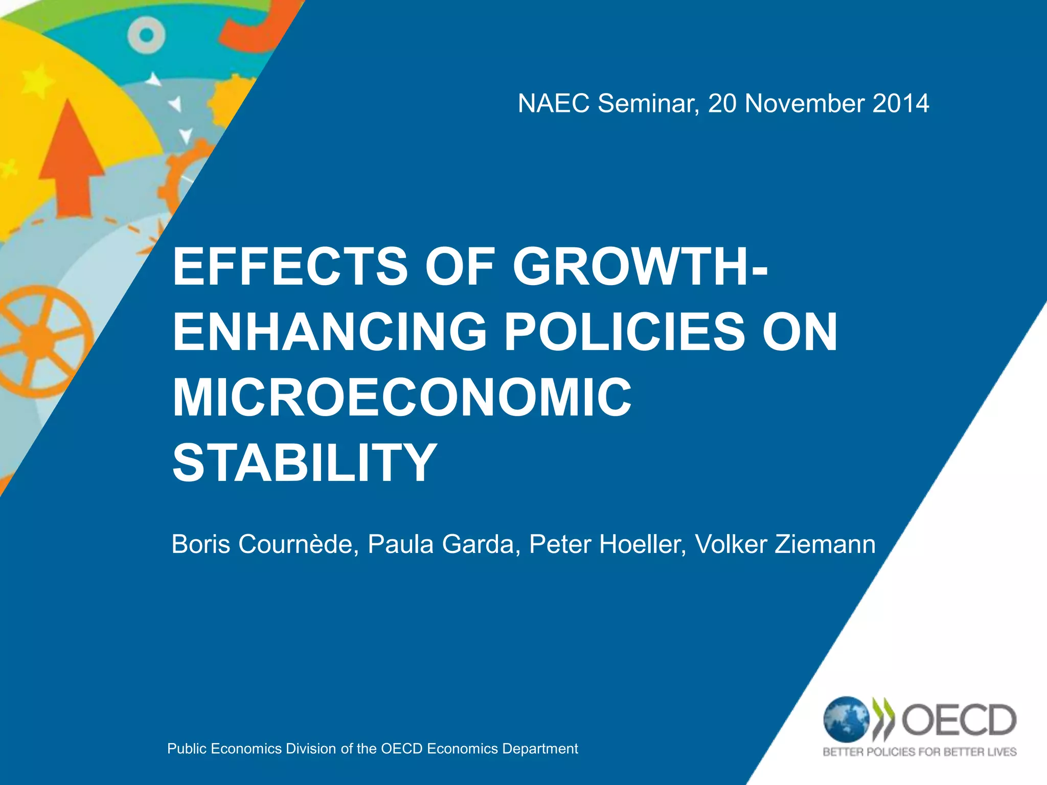 This document summarizes a seminar discussing the effects of growth-enhancing policies on microeconomic stability. It finds that while some pro-growth reforms can increase instability at the individual level, deeper reforms may boost growth without increasing volatility. Reforms like reducing employment protections and unemployment benefits can increase worker reallocation and earnings volatility, while well-designed social programs and competitive markets can attenuate these impacts. Policy settings are linked to a country's distance from the growth-volatility frontier, showing the importance of balancing economic goals.