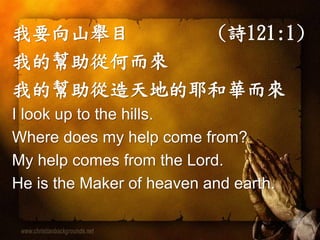 This document contains the lyrics to several Christian worship songs and hymns in Chinese, focusing on themes of praising God, knowing that Jesus is the savior and redeemer, and dedicating one's entire life and being to serving God. It also includes the Lord's Prayer and a brief benediction.