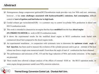 This document summarizes an experimental study of a modified diesel engine operating in homogeneous charge compression ignition (HCCI) combustion mode compared to the original diesel combustion mode. The study found that HCCI combustion provided very low NOx and soot emissions but had challenges with hydrocarbon emissions, fuel consumption, ignition timing control, and performance at high loads. Cooled exhaust gas recirculation was used to control in-cylinder NOx production. Test results showed significant reductions in NOx and smoke emissions for HCCI combustion compared to diesel mode, along with generally higher hydrocarbon and carbon monoxide emissions due to early fuel injection timing and fuel adhering to cylinder walls.