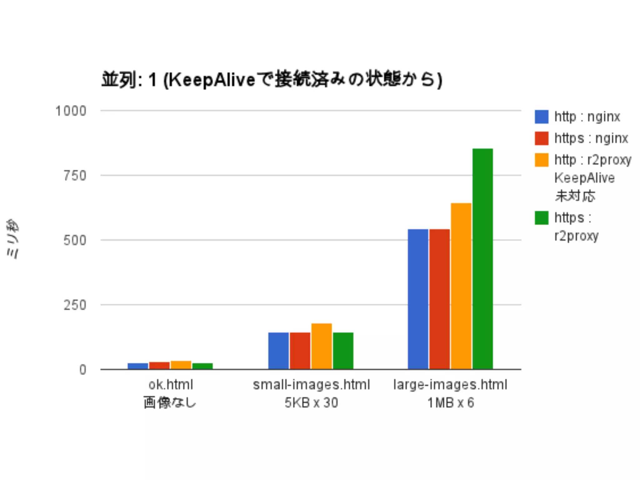 r2proxy は KeepAlive に未対応 • ただし、HTTPS に関しては KeepAlive になる • CONNECTメソッドで接続しているので • キャッシュを Disable にしてページをリロード • ロード後の以下の値の算術平均 • window.performance.timing.domComplete - window.performance.timing.connectStart