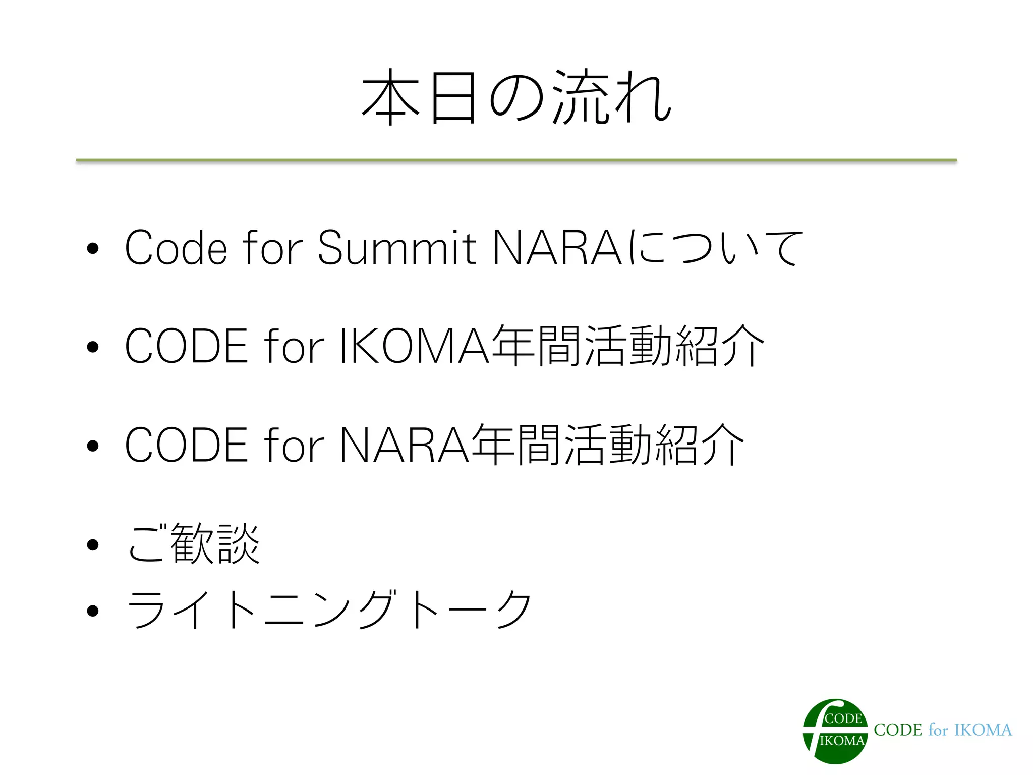 2014/12/22に生駒で行われた、年間成果発表会でお話したスライドです。Code for Summit NARAの概要と、CODE for IKOMAの年間を通じた振り返りの内容となっています。 2014年の発表実績や記事掲載実績もまとめました。