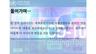 질병관리본부 주관 응급실 손상환자 표본심층조사 사업의 일환으로 2014년 12월에 시행한 코디네이터 교육 워크샵의 교육 주제 중 하나였던 <icd-10> 강의 슬라이드입니다. 자율학습이 가능하도록 원래 강의 슬라이드에 보충 설명을 달았습니다.