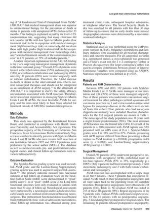 3) Patients with unruptured AVMs had better functional outcomes (91% good) than those with ruptured AVMs (65% good), but equivalent relative outcomes (96-98% improved
